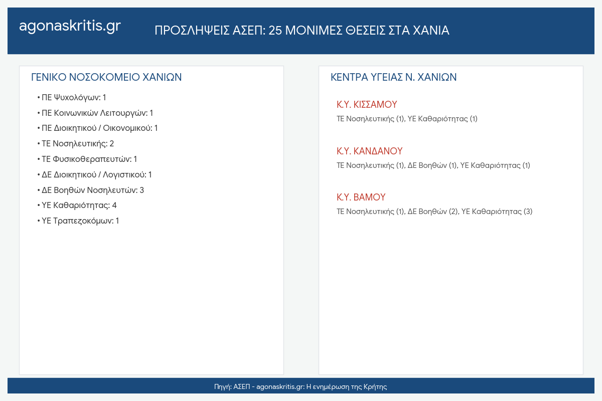 Σε μια κίνηση που στοχεύει στην κάλυψη καίριων κενών και την περαιτέρω θωράκιση των δημόσιων δομών υγείας, δημοσιεύθηκε η νέα προκήρυξη του ΑΣΕΠ για την πλήρωση 510 μόνιμων θέσεων σε νοσοκομεία ολόκληρης της χώρας και σε φορείς που εποπτεύονται από το Υπουργείο Υγείας. Η εξέλιξη αυτή φέρει ιδιαίτερη σημασία για την Περιφερειακή Ενότητα Χανίων, όπου η κατανομή προβλέπει συνολικά 25 θέσεις, οι οποίες επιμερίζονται μεταξύ της κεντρικής νοσοκομειακής μονάδας του νομού και των Κέντρων Υγείας στην ενδοχώρα.