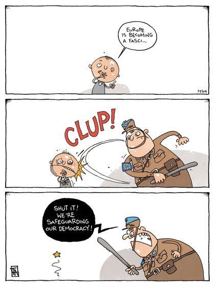 Η Ευρώπη γίνεται όλο και πιο απολυταρχική, τα ιδεώδη καταρρέουν, η διαρκής λιτότητα ωθεί σε διασπάσεις, με τις πλούσιες χώρες του βορρά να αδιαφορούν για τον νότο, πολιτικοί αποφασίζουν να υψώσουν τείχη, όχι για να ανταπεξέλθουν σε κάποια “εισβολή” αλλά για να ικανοποιήσουν μια ακροδεξιά ρητορική που παρουσιάζεται όλο και πιο κυρίαρχη μεταξύ των πλούσιων.