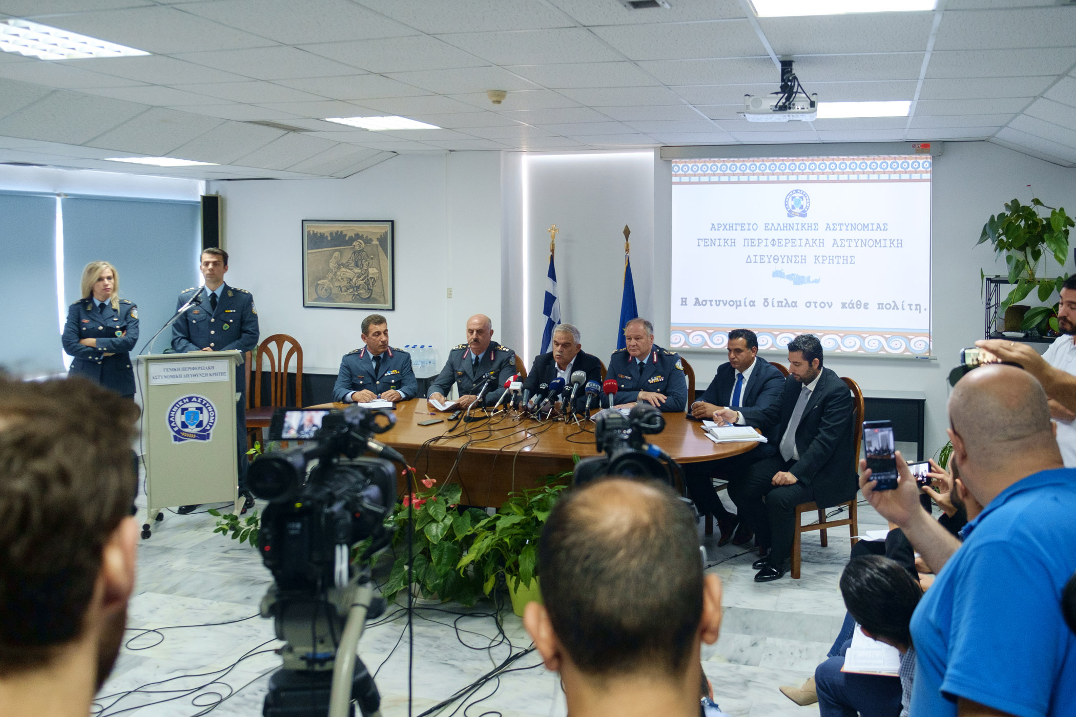 Η συνέντευξη τύπου δόθηκε για να διευκρινησθούν λεπτομέρειες μίας από τις μεγαλύτερες επιτυχίες της Ελληνικής Αστυνομίας με δημοσιογράφους από όλη την Ελλάδα να δίνουν το παρόν στην αίθουσα τύπου της αστυνομίας στα Χανιά.