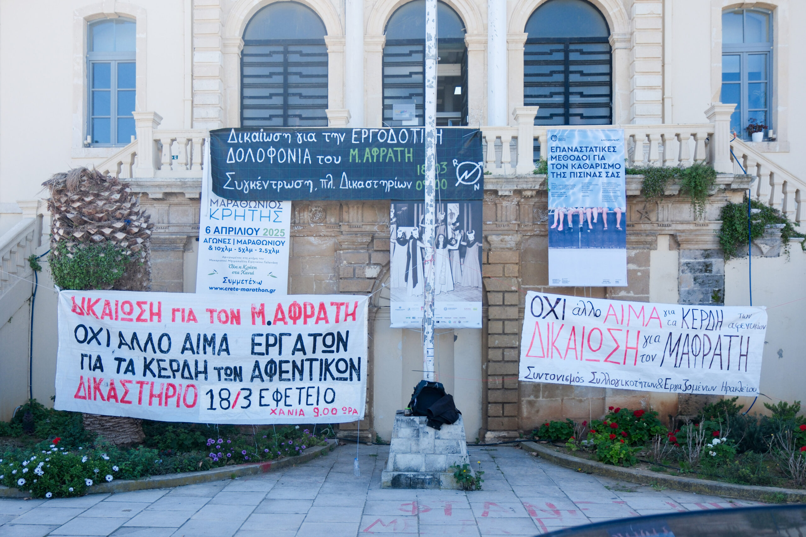 Την καταδίκη της εργοδοσίας για τον θάνατο του Μανώλη Αφράτη ζήτησαν εργατικές συλλογικότητες και αλληλέγγυοι, οι οποίοι πραγματοποίησαν συγκέντρωση διαμαρτυρίας έξω από τα δικαστήρια Χανίων και ανήρτησαν πανό στο Εφετείο Κρήτης.