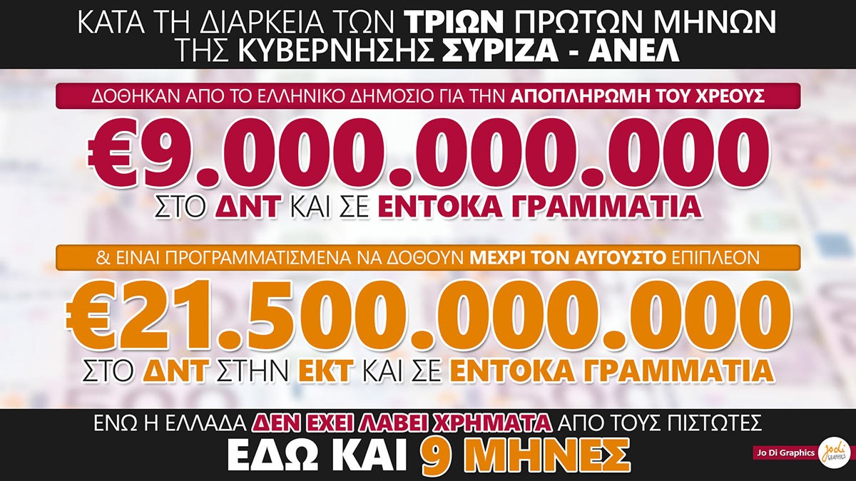 Κατά τη διάρκεια των τριών πρώτων μηνών της κυβέρνησης ΣΥΡΙΖΑ – ΑΝΕΛ, έχουν δοθεί από το ελληνικό δημόσιο για την αποπληρωμή του χρέους περίπου 9 δισ. ευρώ κυρίως προς το ΔΝΤ και σε έντοκα γραμμάτια.