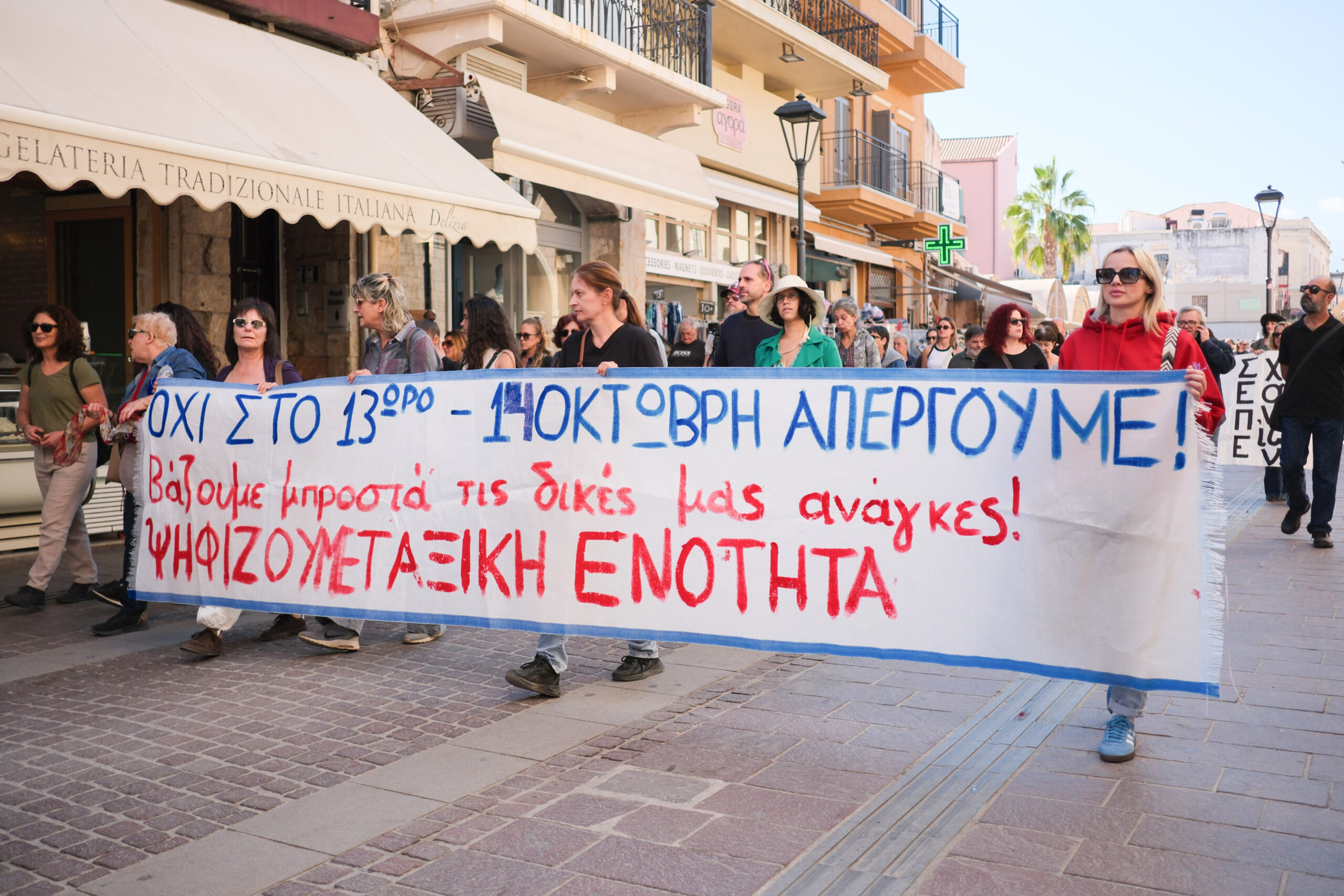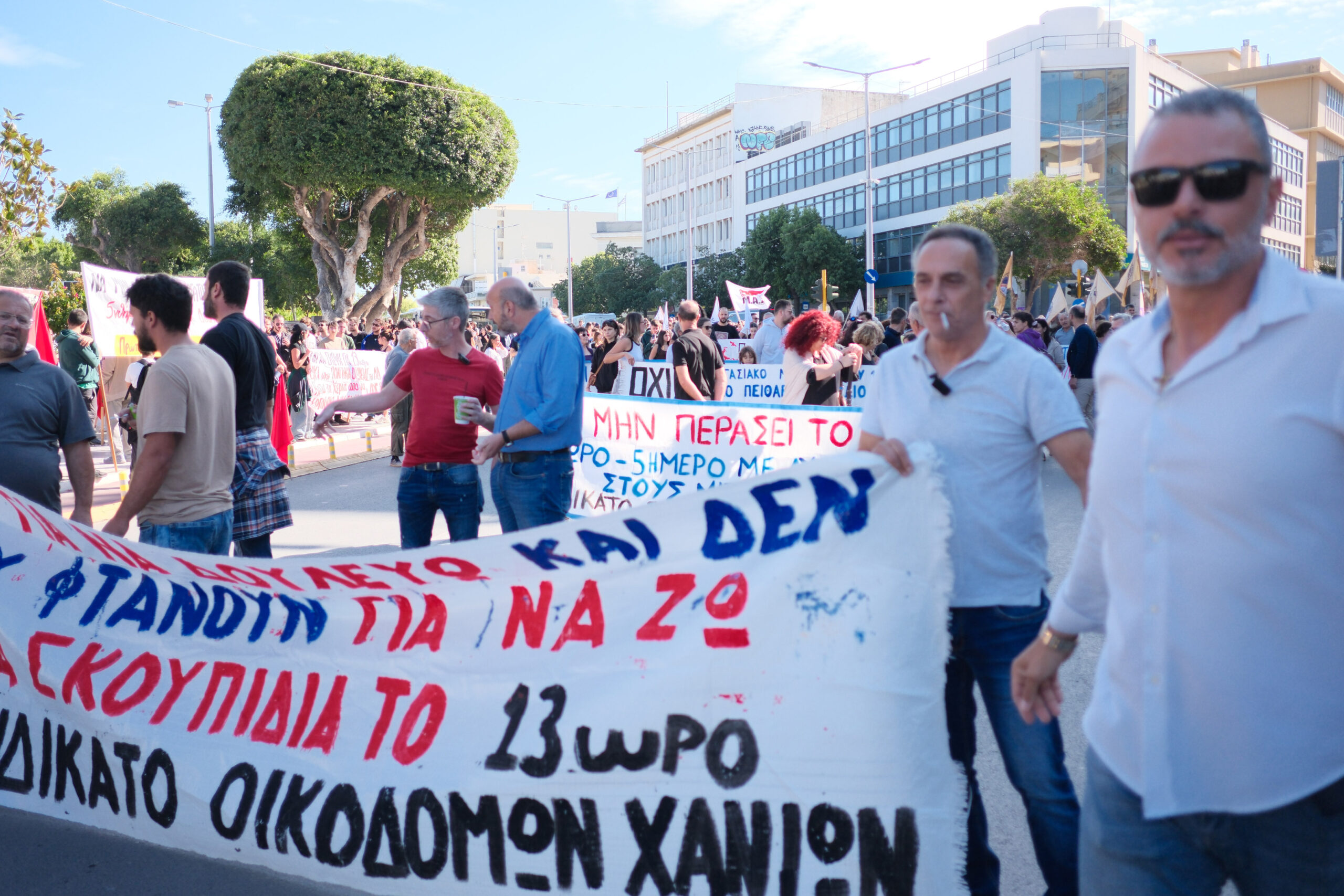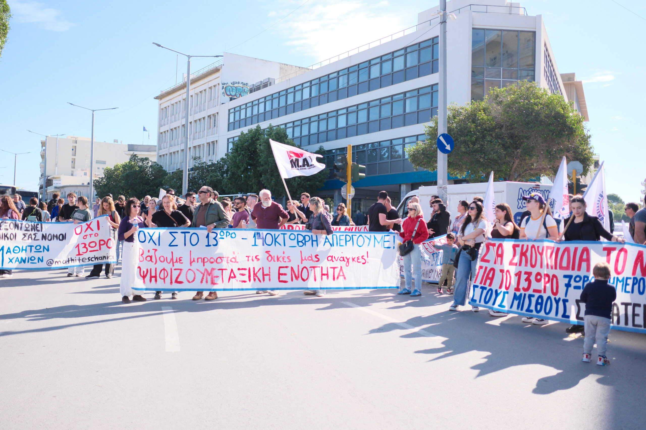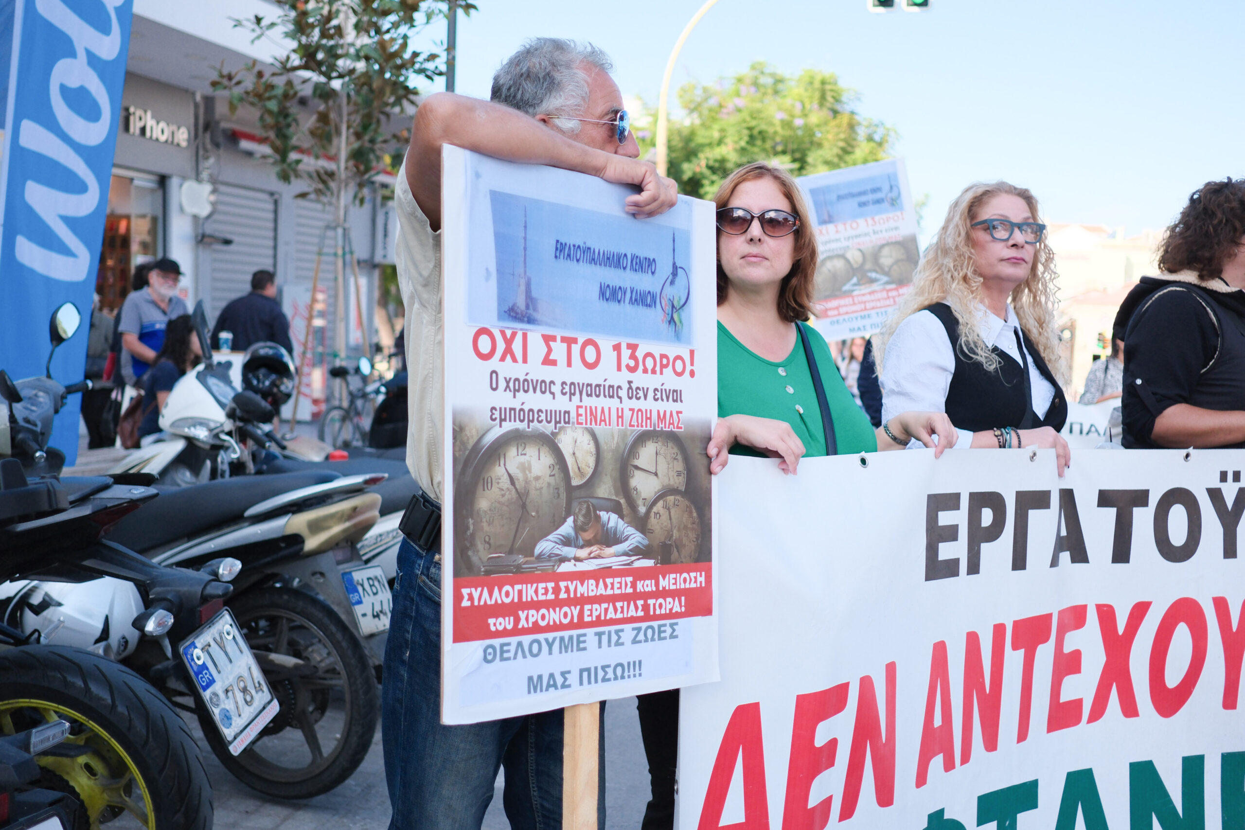 Με συνθήματα όπως «Δεν είμαστε μηχανές» και «Δεν θα μας γυρίσουν στον Μεσαίωνα», εργαζόμενοι στον ιδιωτικό και τον δημόσιο τομέα, εκπαιδευτικοί, εργαζόμενοι στον τουρισμό, στον επισιτισμό και στην ιδιωτική εκπαίδευση, μαζί με φοιτητές του Πολυτεχνείου Κρήτης, βρέθηκαν την Τρίτη 14 Οκτωβρίου στην καρδιά των Χανίων, σε μια ηχηρή απεργιακή κινητοποίηση ενάντια στο νέο εργασιακό νομοσχέδιο που φέρνει έως και 13 ώρες δουλειά την ημέρα.