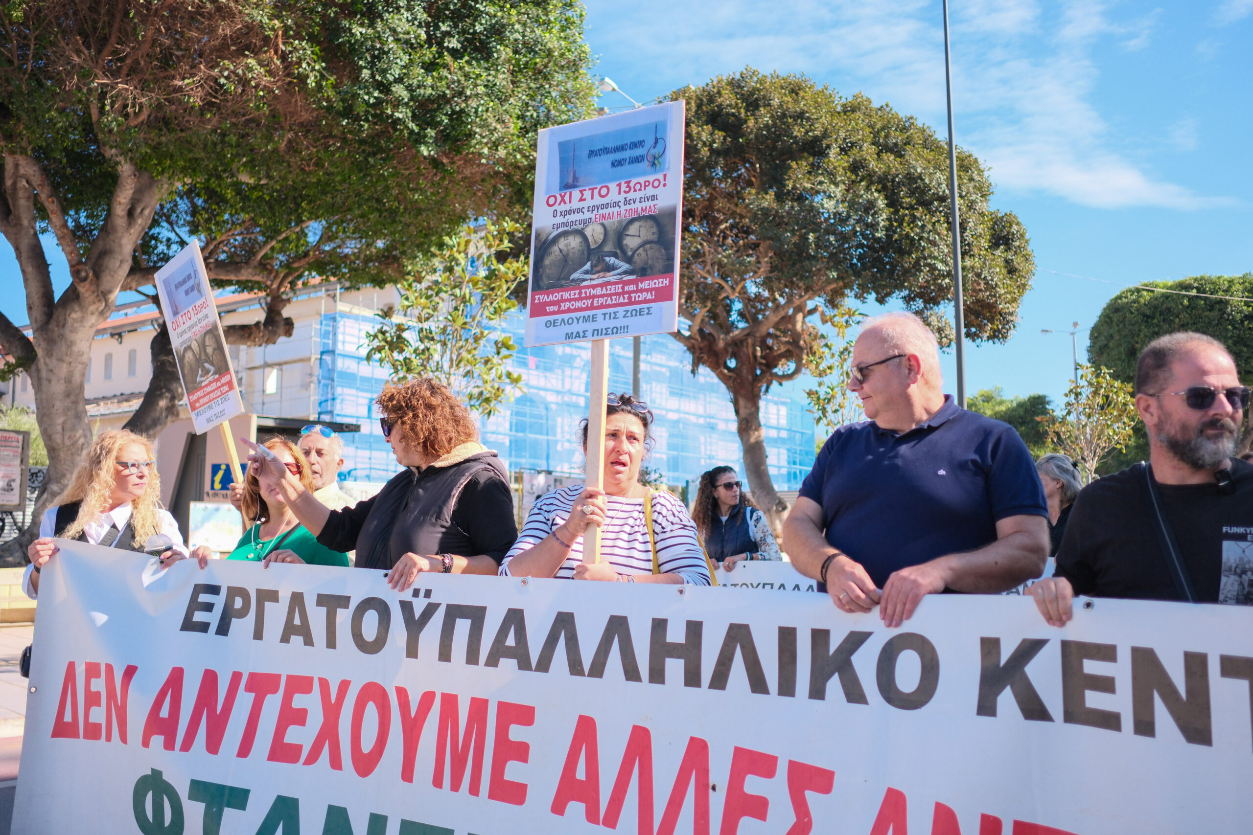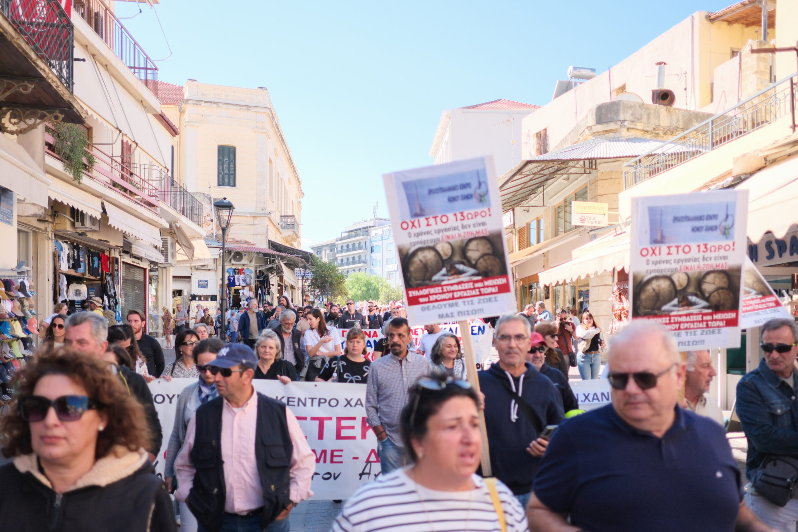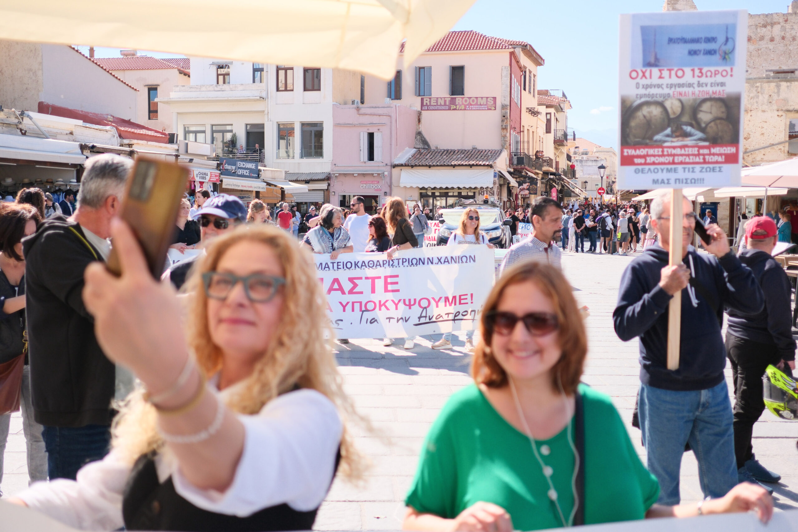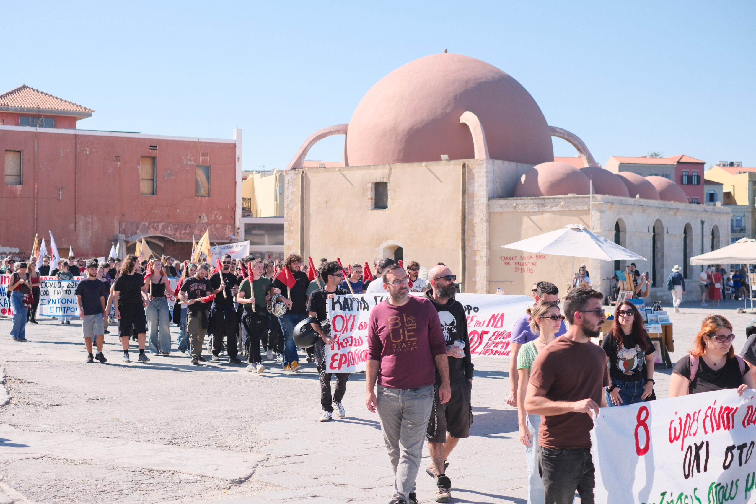 Με συνθήματα όπως «Δεν είμαστε μηχανές» και «Δεν θα μας γυρίσουν στον Μεσαίωνα», εργαζόμενοι στον ιδιωτικό και τον δημόσιο τομέα, εκπαιδευτικοί, εργαζόμενοι στον τουρισμό, στον επισιτισμό και στην ιδιωτική εκπαίδευση, μαζί με φοιτητές του Πολυτεχνείου Κρήτης, βρέθηκαν την Τρίτη 14 Οκτωβρίου στην καρδιά των Χανίων, σε μια ηχηρή απεργιακή κινητοποίηση ενάντια στο νέο εργασιακό νομοσχέδιο που φέρνει έως και 13 ώρες δουλειά την ημέρα.