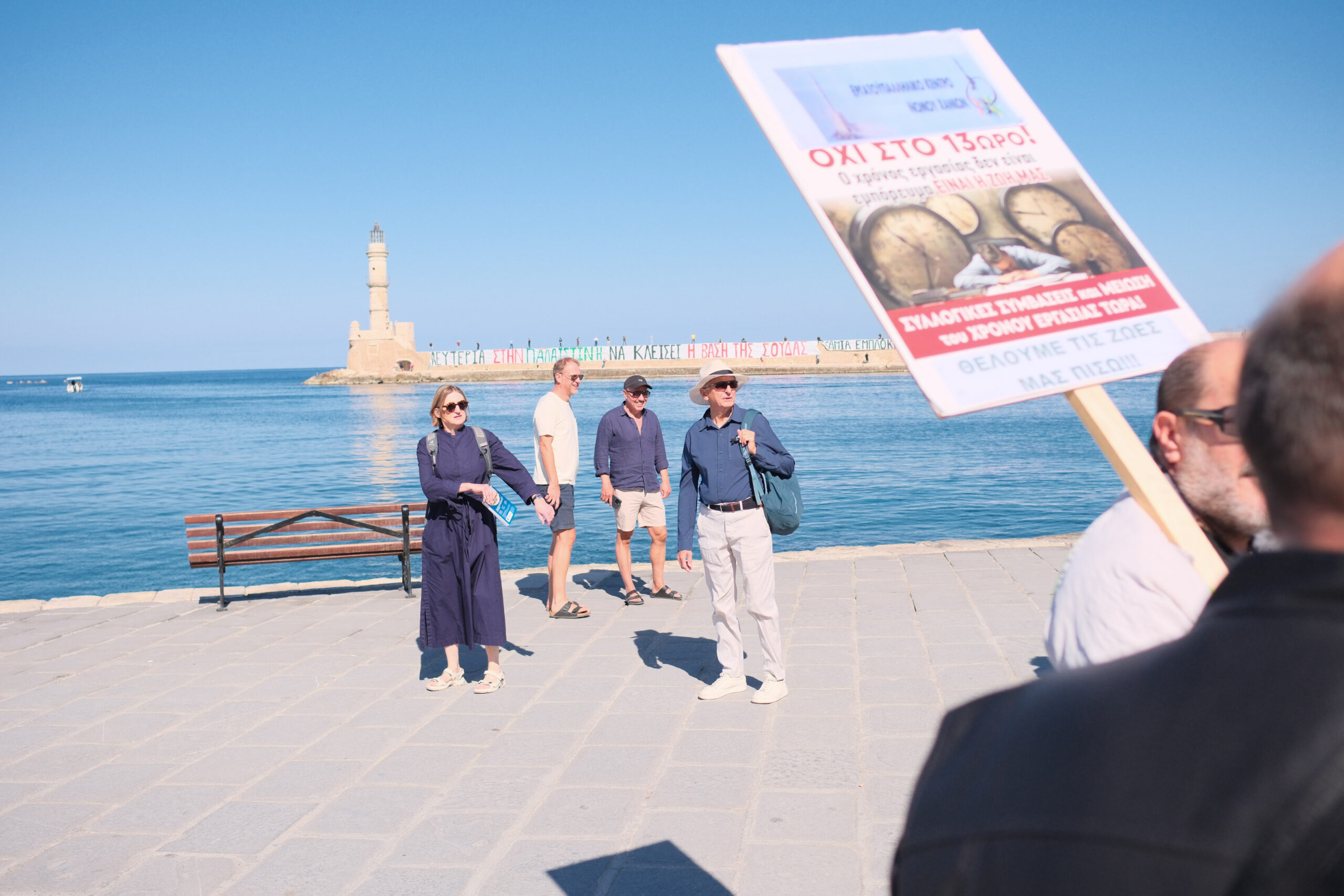 Η Ταξική Ενότητα Ξενοδοχοϋπαλλήλων Χανίων συμμετείχε δυναμικά στην κινητοποίηση, καταγγέλλοντας το νομοσχέδιο ως «τερατούργημα» που εξυπηρετεί μόνο τους μεγαλοεργοδότες.