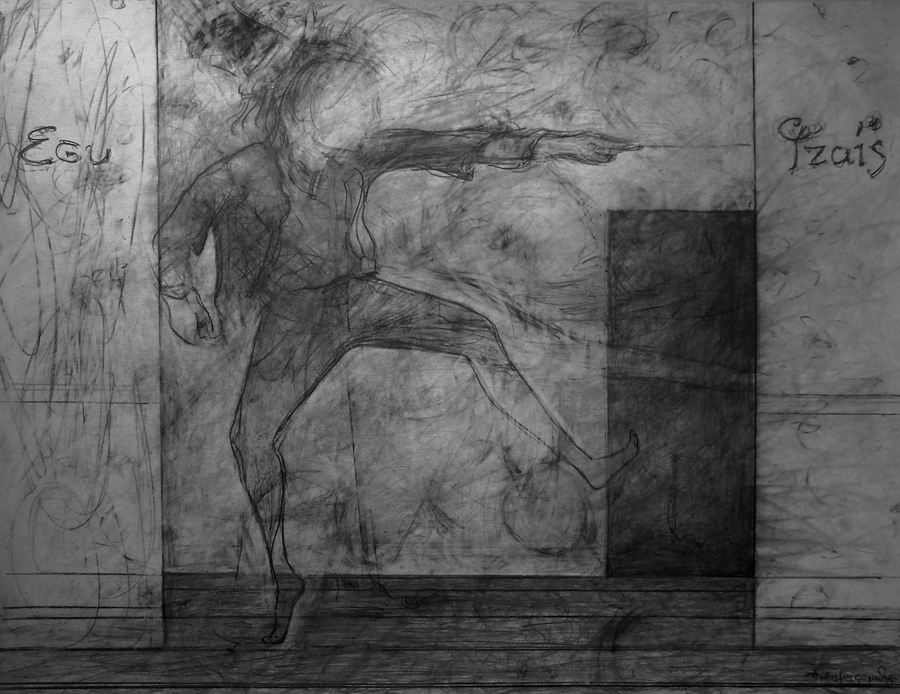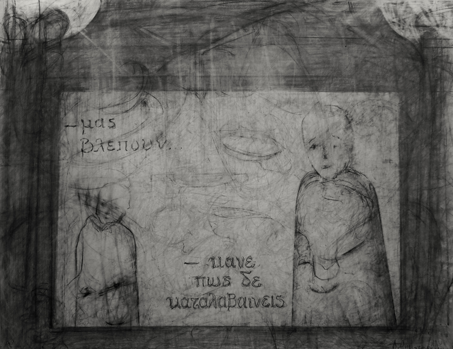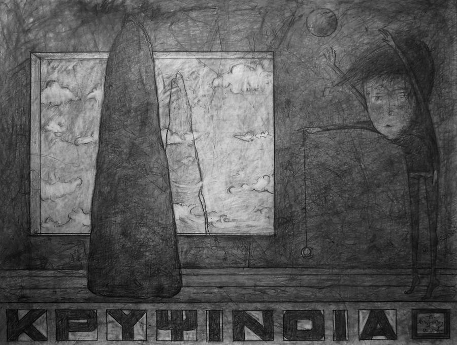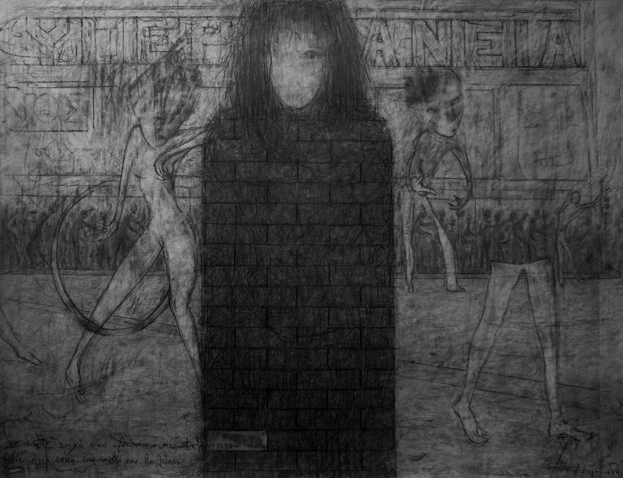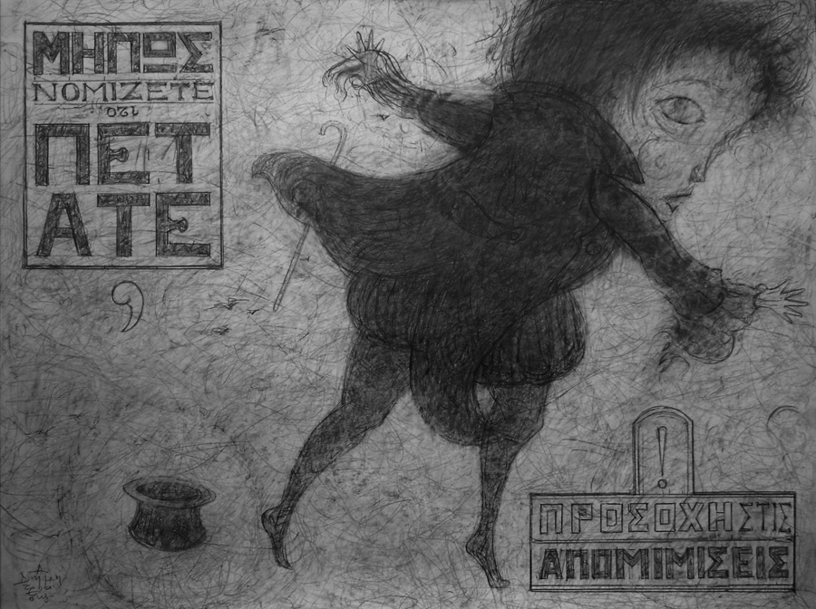 Ο επιμελητής Ιωάννης Ν. Αρχοντάκης αναφέρει: «Ο Αλέξανδρος Δημητριάδης καταγράφει με μαύρο και γκρι έναν κόσμο ερμητικά κλειστό στους παρείσακτους εισβολείς που δεν διαθέτουν τους μυστικούς κωδικούς εισόδου. Κλειστός, μυστικός, μαγικός, αέρινος, ιδιωτικός εσωτερικός κόσμος. Σύνεργα, εργαλεία, σύμβολα, γράμματα και λέξεις κρατούν κομβικές συντεταγμένες και καθοδηγούν τον μίτο της εξέλιξης πάνω ψηλά στον αέρα, κάτω μέσα στη γη, στο κάπου, στο τέλος, στο πουθενά. Στη Χώρα των Θαυμάτων, στη χώρα των παιδικών ονείρων, στον εσωτερικό μανδύα των μύχιων ελπίδων και φόβων του δημιουργού. Ανάμεσα σε άυλες μορφές, φάσματα και φαντάσματα ο ίδιος ο καλλιτέχνης παρεισφρέει αθόρυβα πίσω από μάσκες, μέσα από κάτοπτρα, κάτω από το αστείο καπέλο ενός γελωτοποιού –παιδί πάντα ο ίδιος– πρωταγωνιστής στα όνειρα που επικίνδυνα ισορροπούν στα όρια του εφιάλτη».