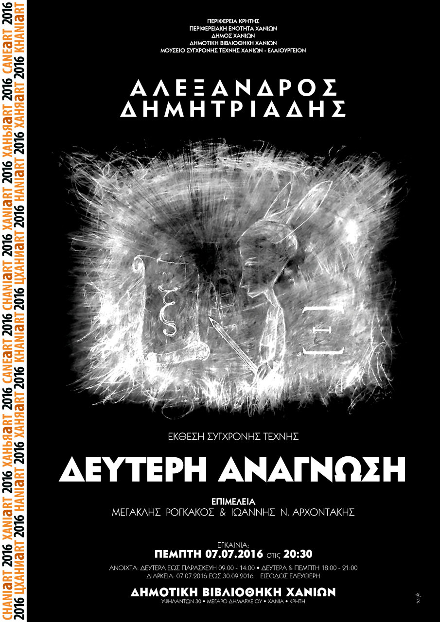 ΧΑΝΙΑ.– Στις 7 Ιουλίου 2016, η Δημοτική Βιβλιοθήκη Χανίων και το Μουσείο Σύγχρονης Τέχνης Χανίων – Ελαιουργείον, εγκαινιάζουν την έκθεση σύγχρονης τέχνης «Δεύτερη Ανάγνωση» του Αλέξανδρου Δημητριάδη σε επιμέλεια του Μεγακλή Ρογκάκου και του Ιωάννη Ν. Αρχοντάκη στη Δημοτική Βιβλιοθήκη Χανίων, Υψηλαντών 30, Μέγαρο Δημαρχείου, Χανιά, Κρήτη.