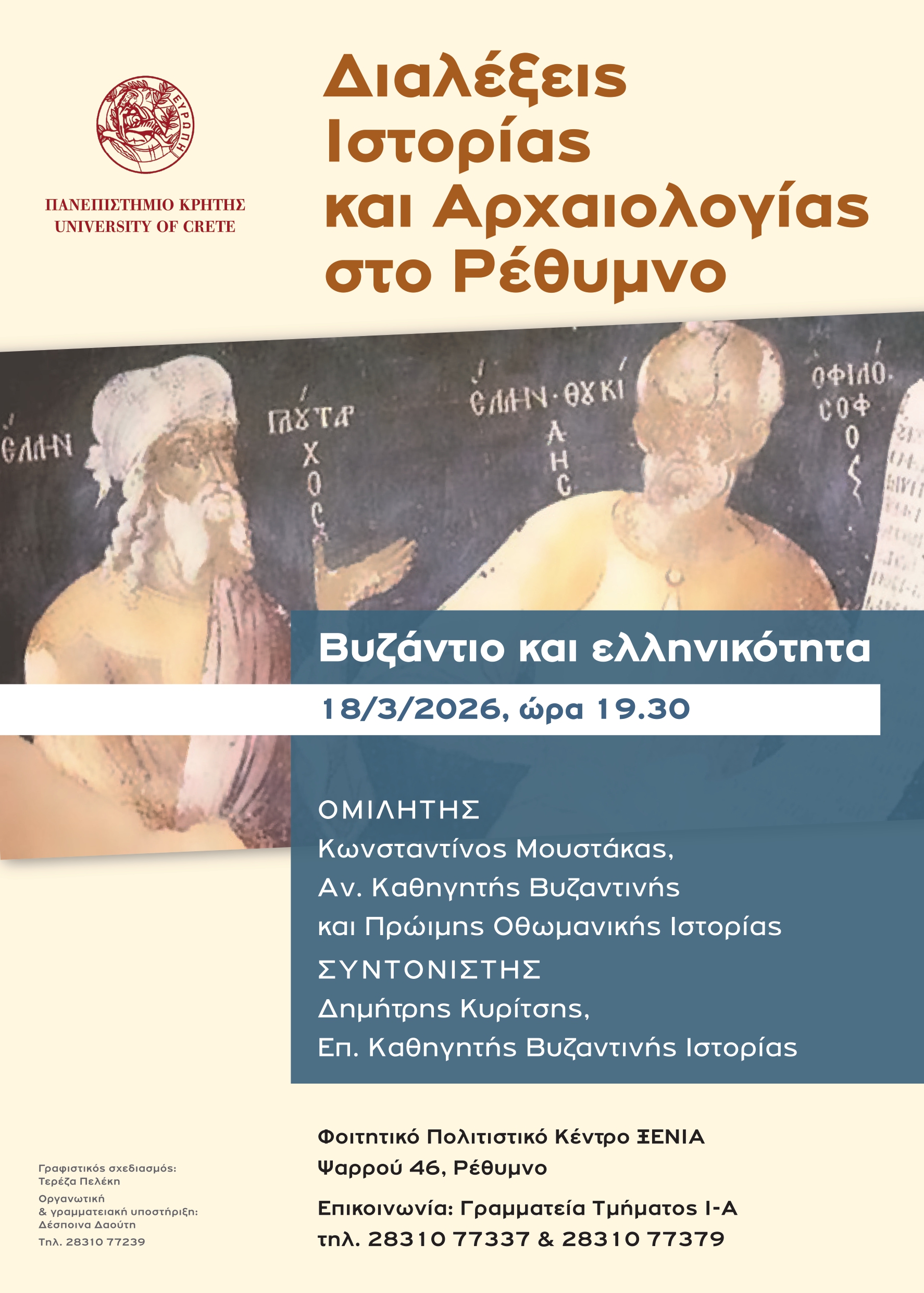 Το Τμήμα Ιστορίας και Αρχαιολογίας του Πανεπιστημίου Κρήτης συνεχίζει τον κύκλο διαλέξεων «Διαλέξεις Ιστορίας και Αρχαιολογίας στο Ρέθυμνο» με τη δεύτερη εκδήλωση, η οποία θα πραγματοποιηθεί την Τετάρτη 18 Μαρτίου 2026.