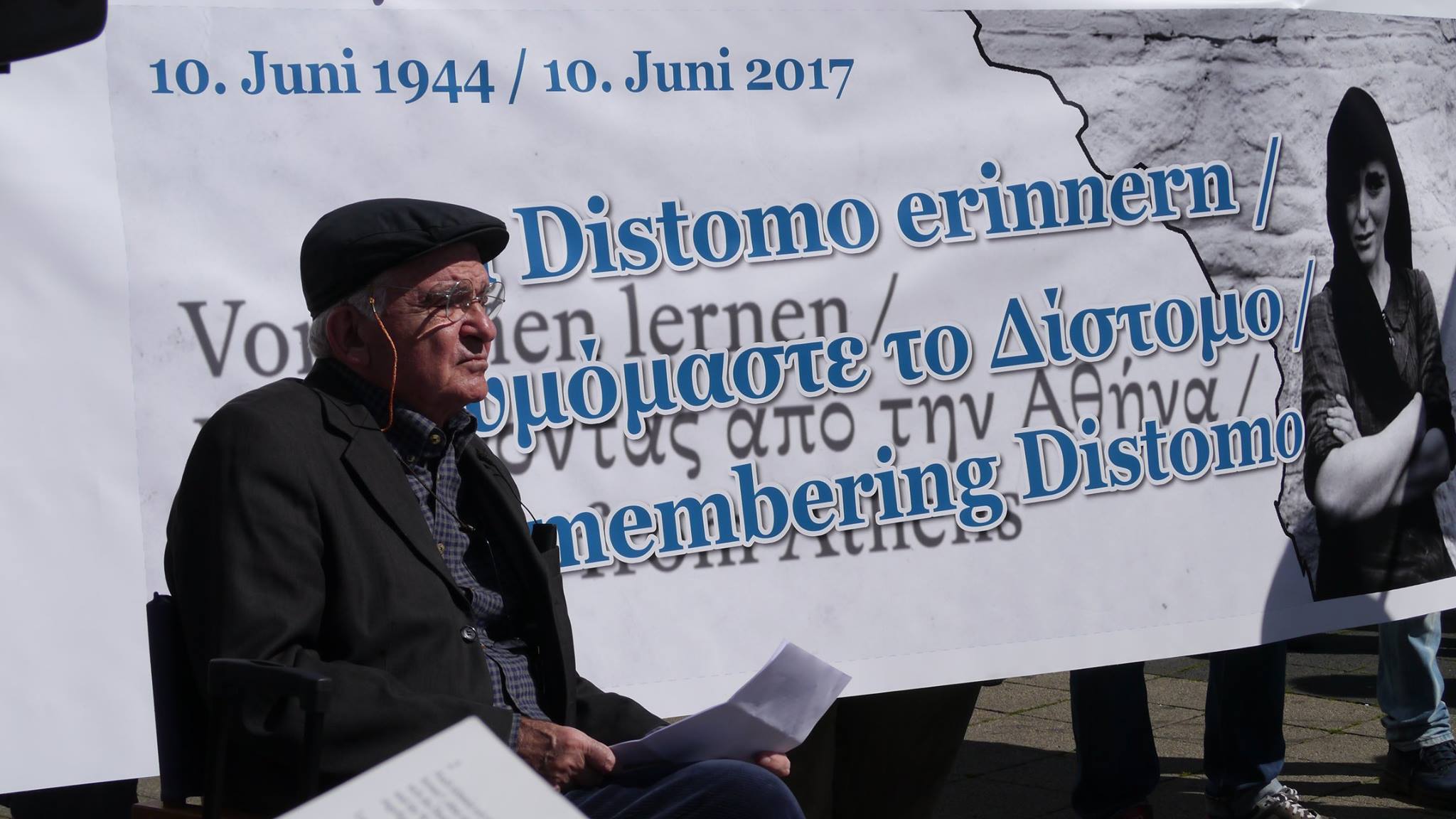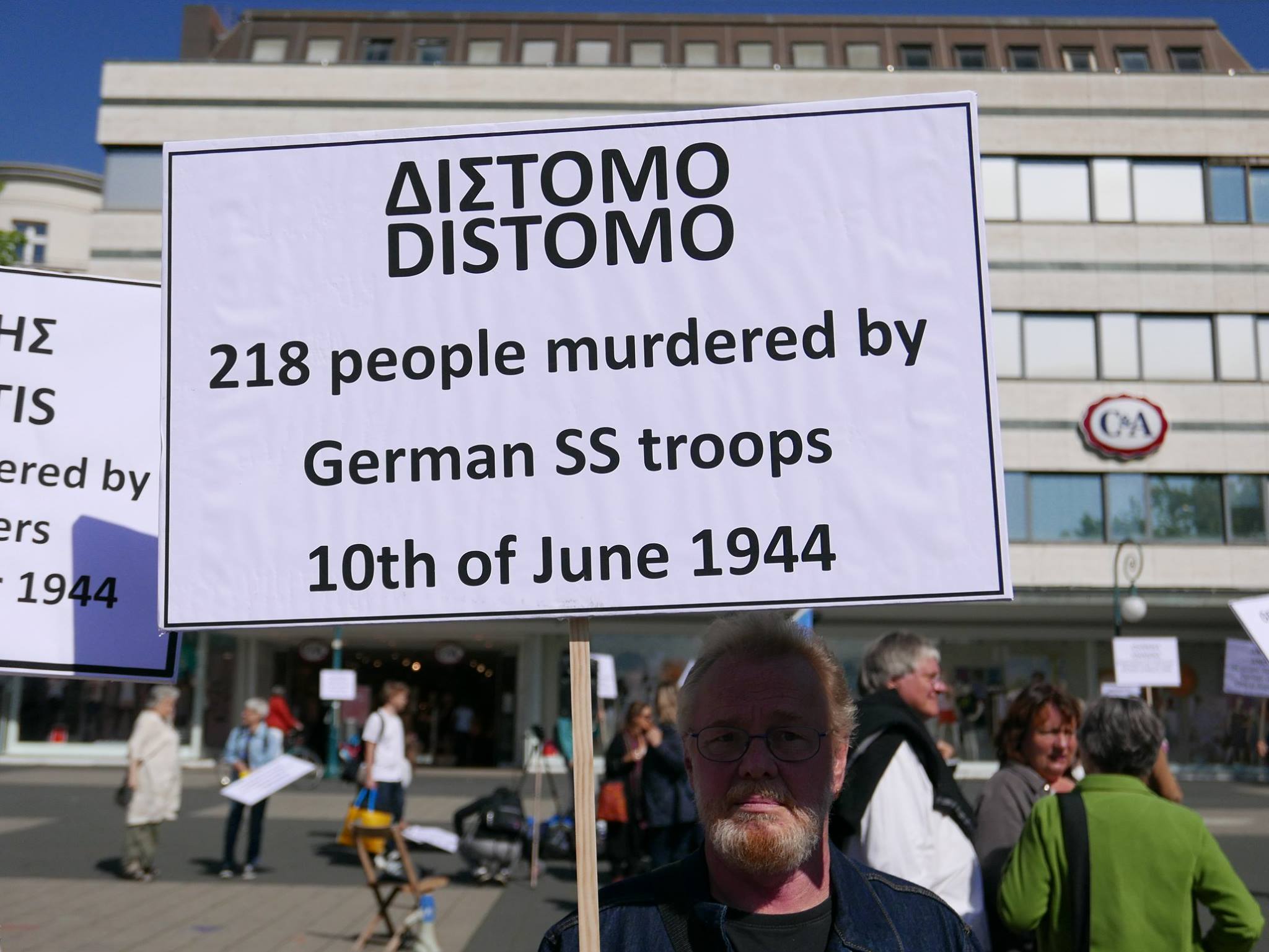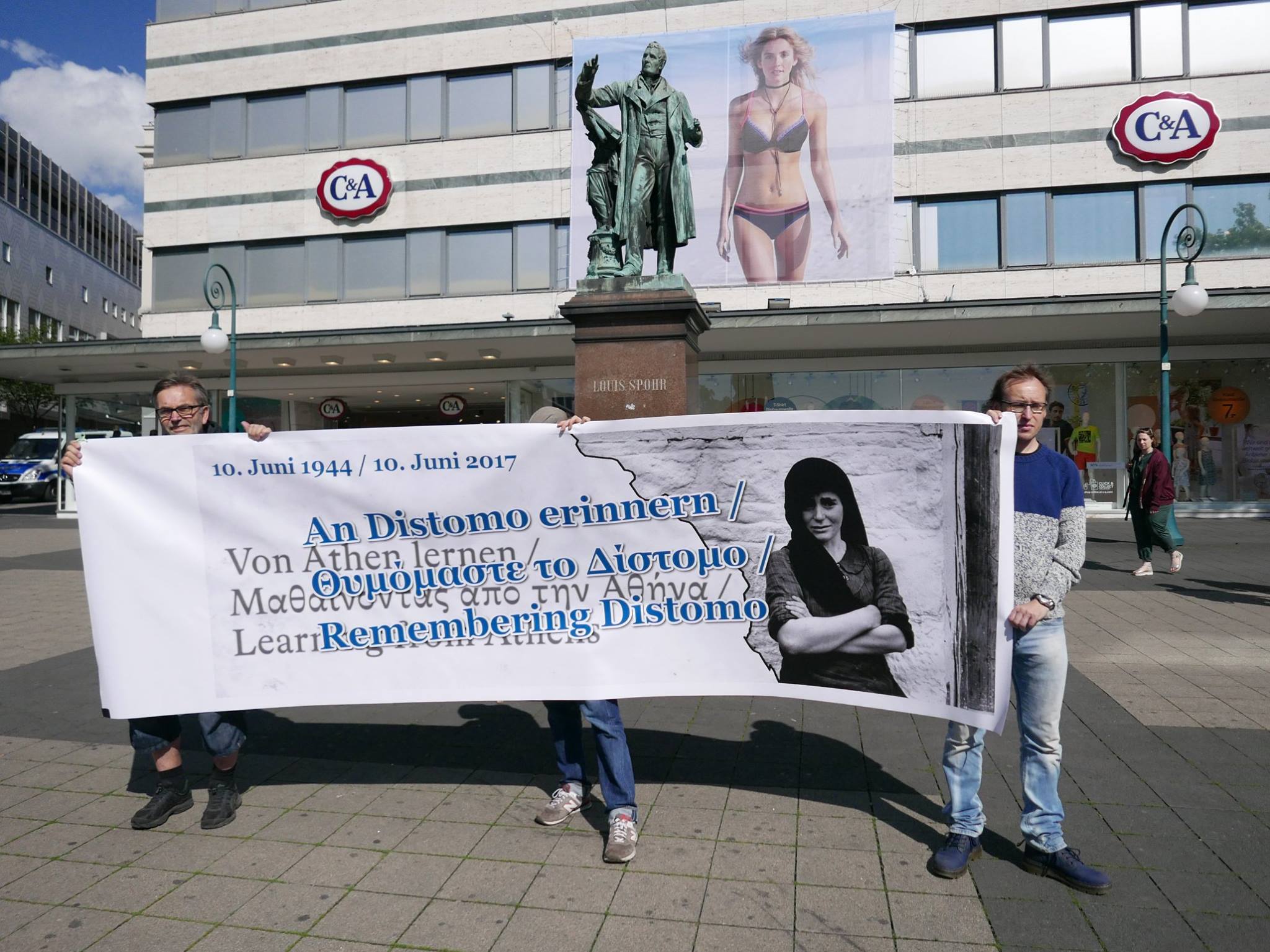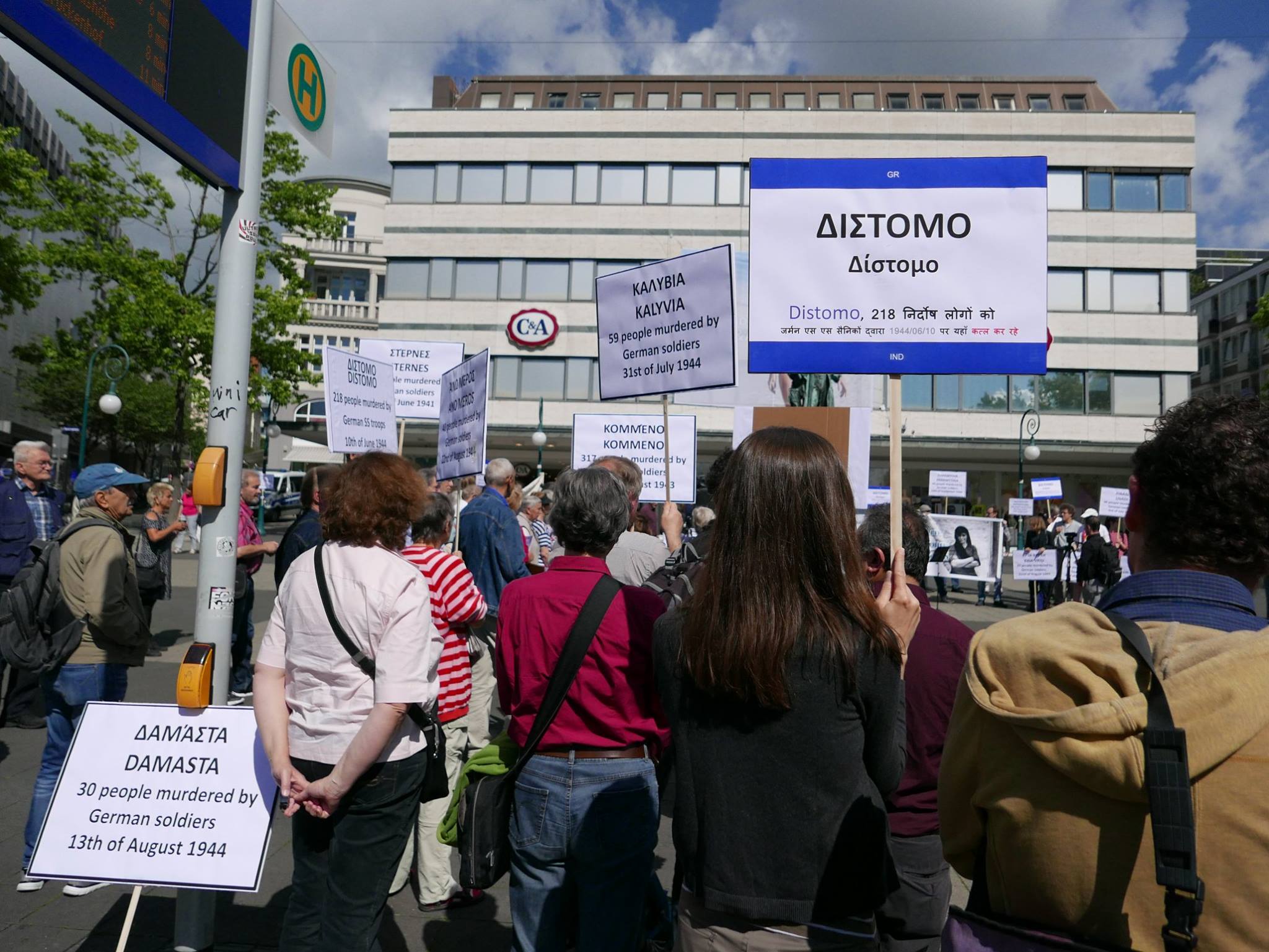 Την ημέρα των εγκαινίων υπήρχε διαμαρτυρία με 50 πλακάτ και τα ονόματα των μαρτυρικών δήμων της Ελλάδας με ημερομηνία των σφαγών και τον αριθμό των θυμάτων. Στο κεντρικό πλακάτ έγραφε “Θυμόμαστε το Δίστομο”. Πλακάτ υπήρχαν και για τα εγκλήματα των ναζί στην Άνω Βιάννο, στον Ταυρωνίτη, στο Κοντομαρί, στις Στέρνες, στο Γερακάρι.