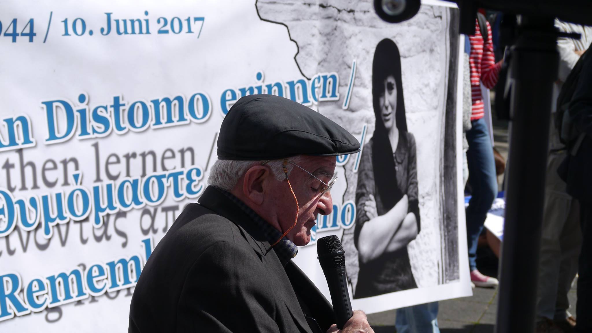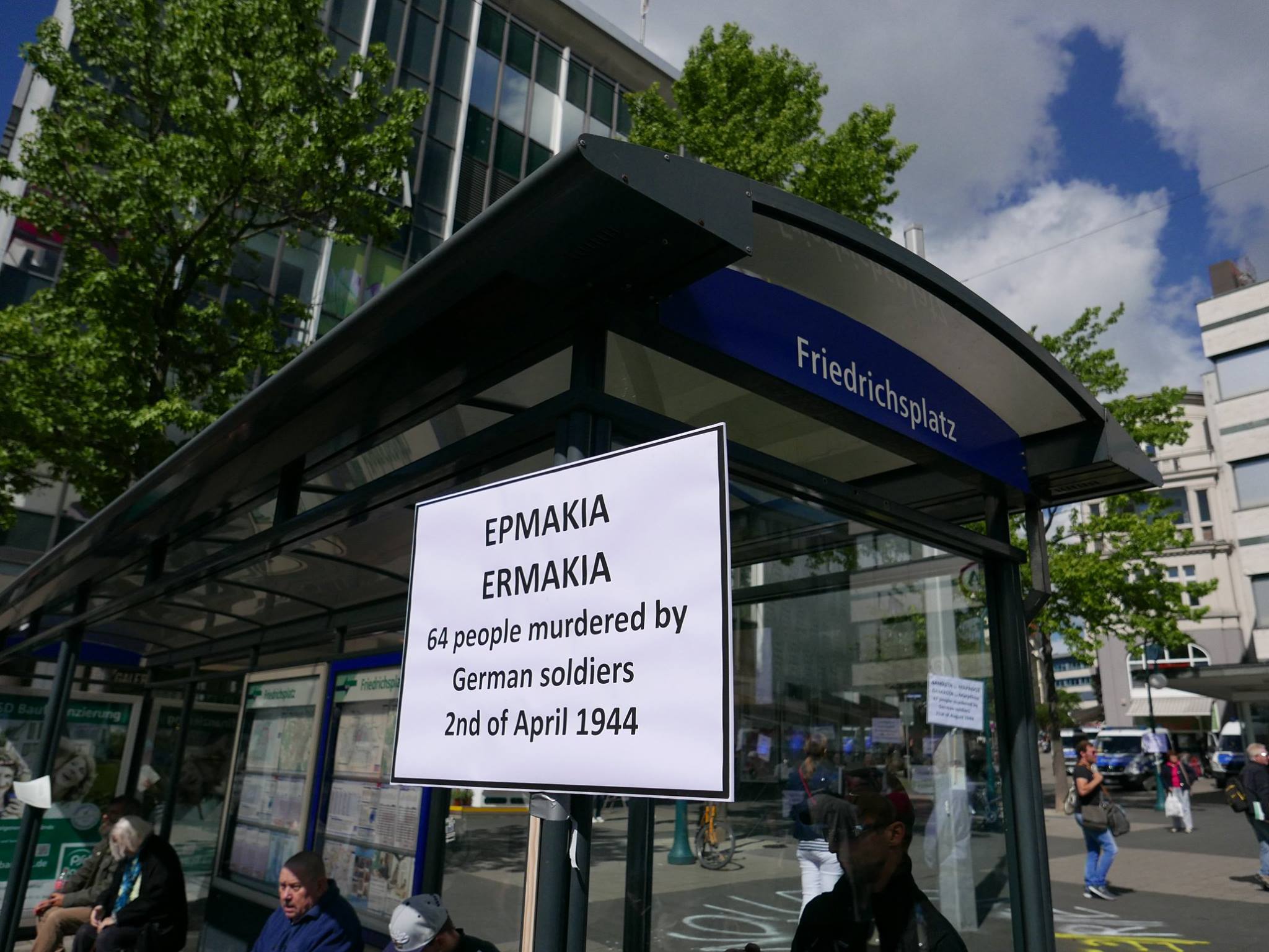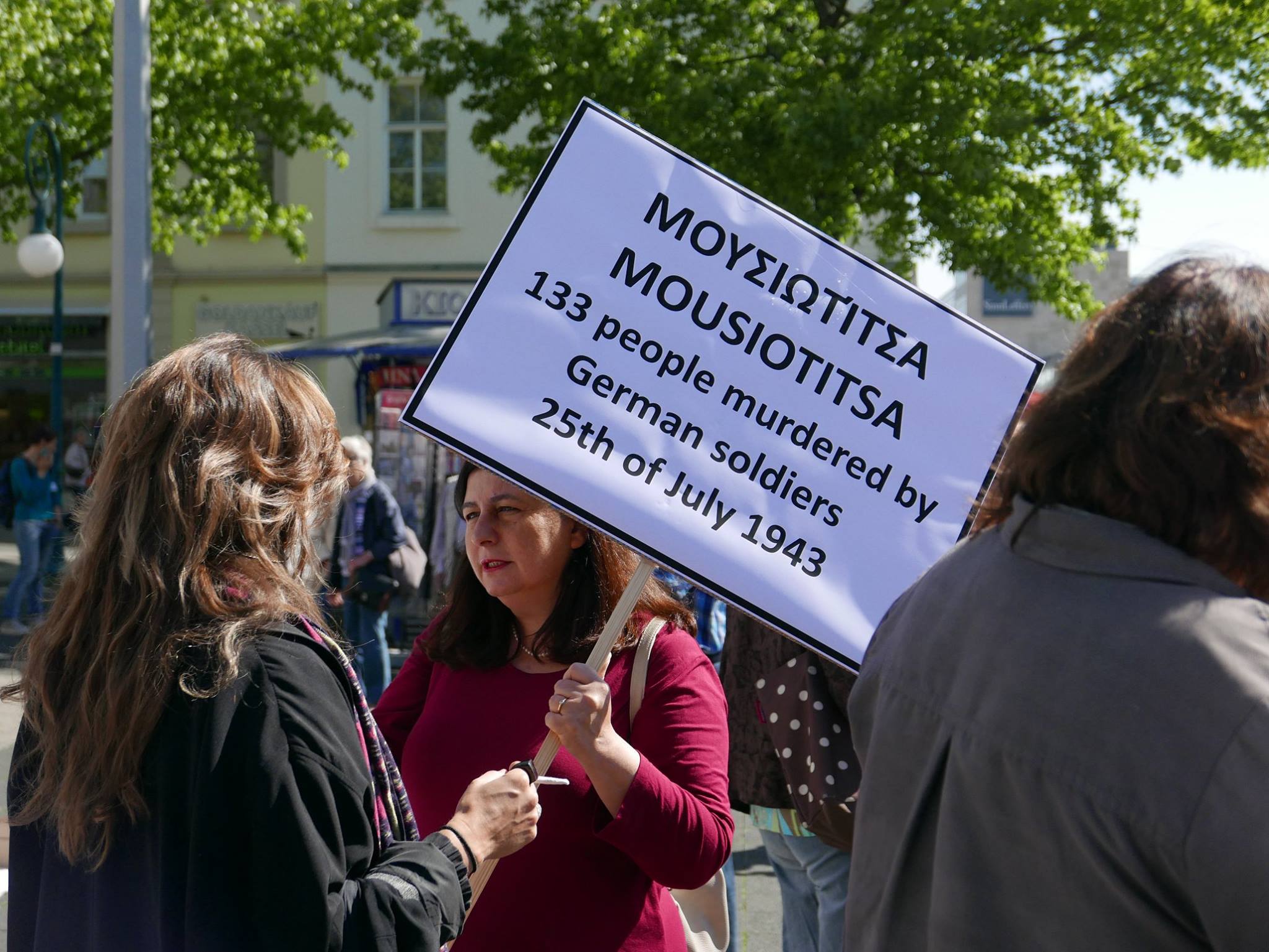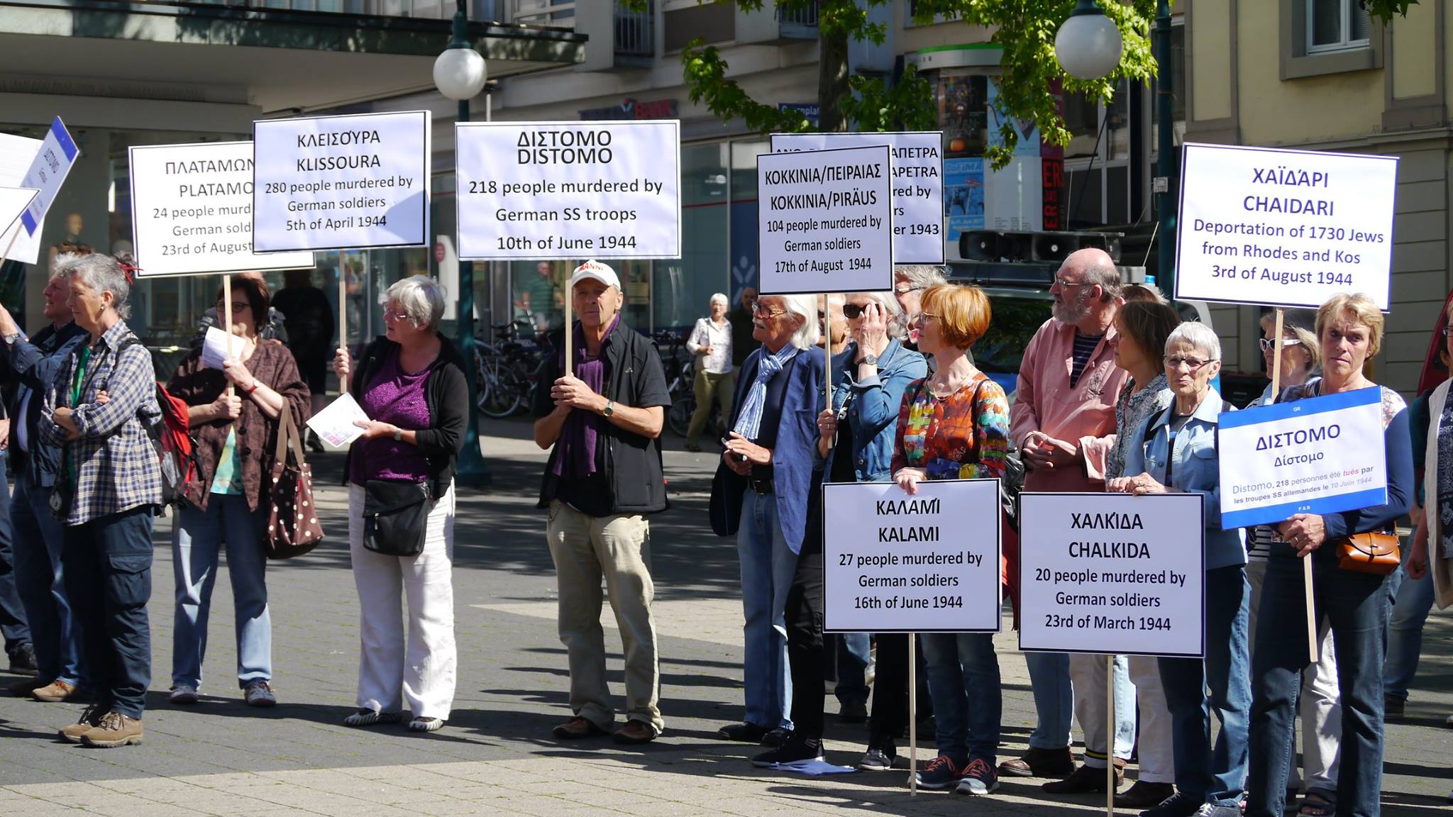 Την ημέρα των εγκαινίων υπήρχε διαμαρτυρία με 50 πλακάτ και τα ονόματα των μαρτυρικών δήμων της Ελλάδας με ημερομηνία των σφαγών και τον αριθμό των θυμάτων. Στο κεντρικό πλακάτ έγραφε “Θυμόμαστε το Δίστομο”. Πλακάτ υπήρχαν και για τα εγκλήματα των ναζί στην Άνω Βιάννο, στον Ταυρωνίτη, στο Κοντομαρί, στις Στέρνες, στο Γερακάρι.