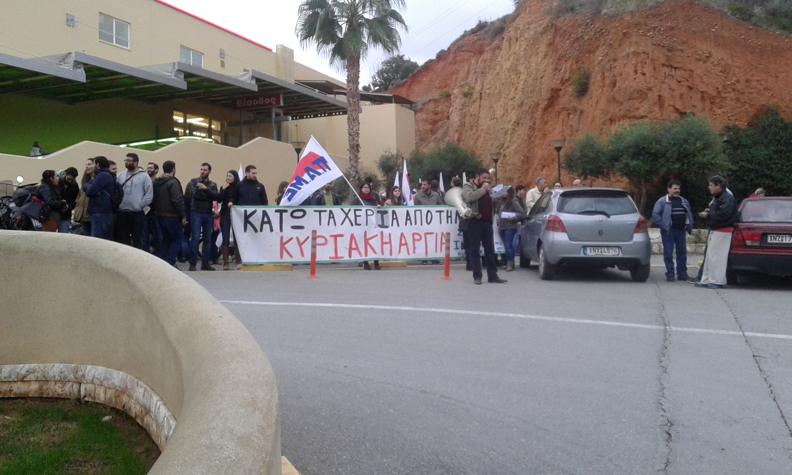 Με αφορμή την κήρυξη απεργίας την Κυριακή 1 Νοέμβρη, εργαζόμενοι από το Σωματείο Ιδιωτικών Υπαλλήλων ν. Χανίων πραγματοποίησαν παράσταση διαμαρτυρίας έξω από τα υπερκαταστήματα των HnM και JUMBO αλλά και έξω από το ΔΙΑΦΑΝΟ.