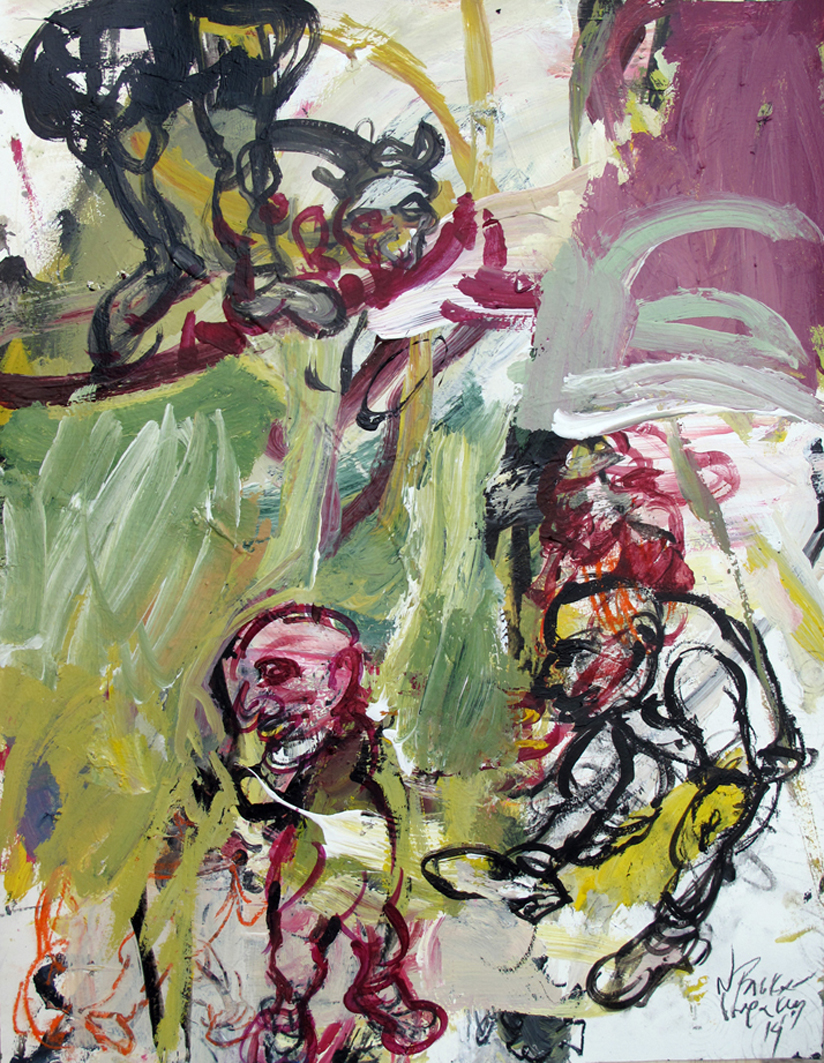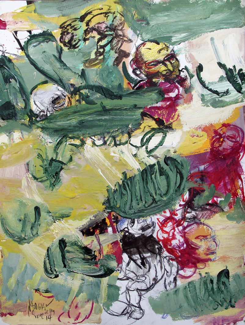 …Ο θεατής καλείται να διαβάσει την εξπρεσιονιστική αφήγηση που ξεδιπλώνεται στα έργα. Βλέπει μπροστά του δισδιάστατα έργα με σκούρες ανθρωπόμορφες αποδομημένες φιγούρες, οι οποίες κινούνται ή στέκονται τοποθετημένες σε επάλληλα επίπεδα. Κάποιες μεγαλύτερες διακρίνονται ενίοτε στο κέντρο, περιτριγυρισμένες από άλλες μικρότερες, με κόκκινα χείλια, με καπέλα, με χρυσές προσωπίδες, ή που φορούν στέμματα και κρατούν σκήπτρα. Άλλες πάλι με τον φαρδύ τους λαιμό συνυπάρχουν με κάποιες που πλάθονται με χρυσοκίτρινες πλατιές πινελιές. Κάποιες παρακολουθούν από ψηλά μέσα σε μαύρα σύννεφα. Δύο τρεις γεμάτες φόρμες θυμίζουν κάποτε, κάποτε βάρκες, με κόκκινες, άσπρες και μαύρες χοντρές πινελιές. Σε όλες δεσπόζουν τα σκούρα σκιερά περιγράμματα, κάνοντάς τις να μοιάζουν με ονειρικά φαντάσματα, δίχως σάρκα και οστά, απερίφραστα, έντονα, αμφιλεγόμενα.