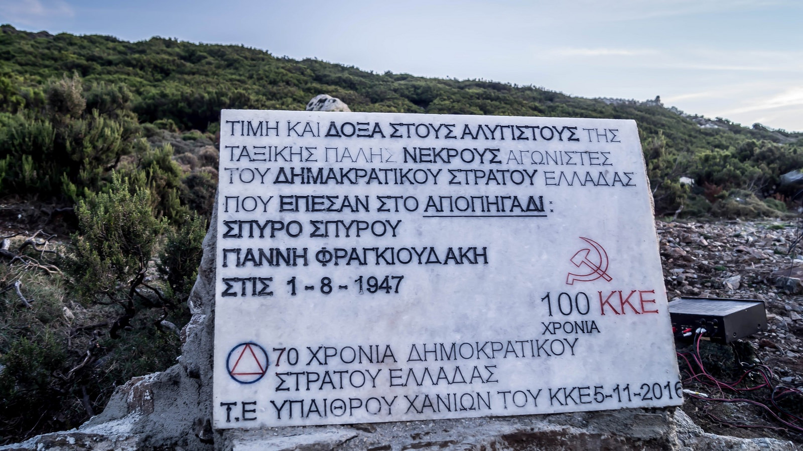 Ακολούθησε το αποκαλυπτήριο του μνημείου που φτιάχτηκε στον χώρο προς τιμή των πεσόντων μαχητών, κατατέθηκαν στέφανα από την Τομεακή Επιτροπή Υπαίθρου του ΚΚΕ και το Παράρτημα Χανίων της ΠΕΑΕΑ-ΔΣΕ και μαζικούς φορείς της περιοχής.