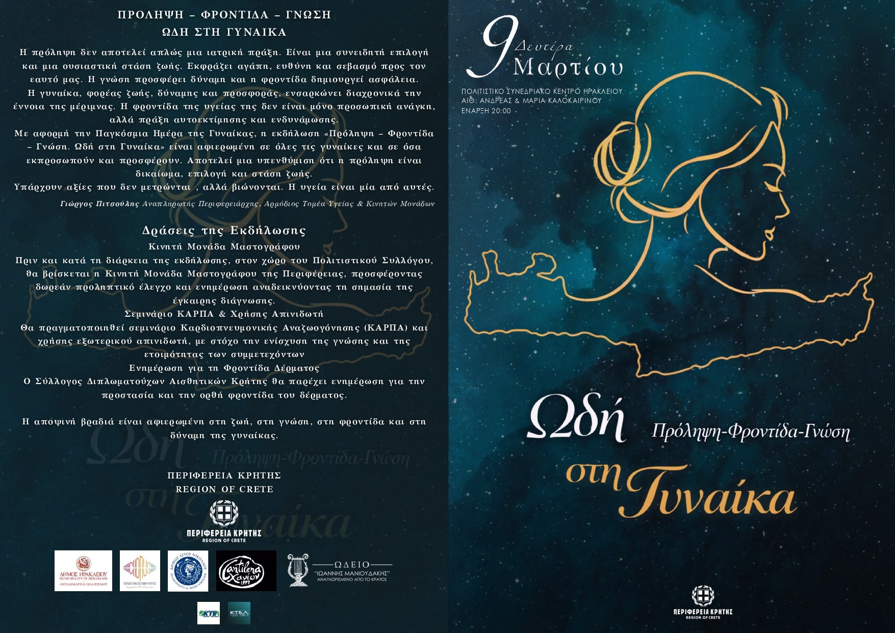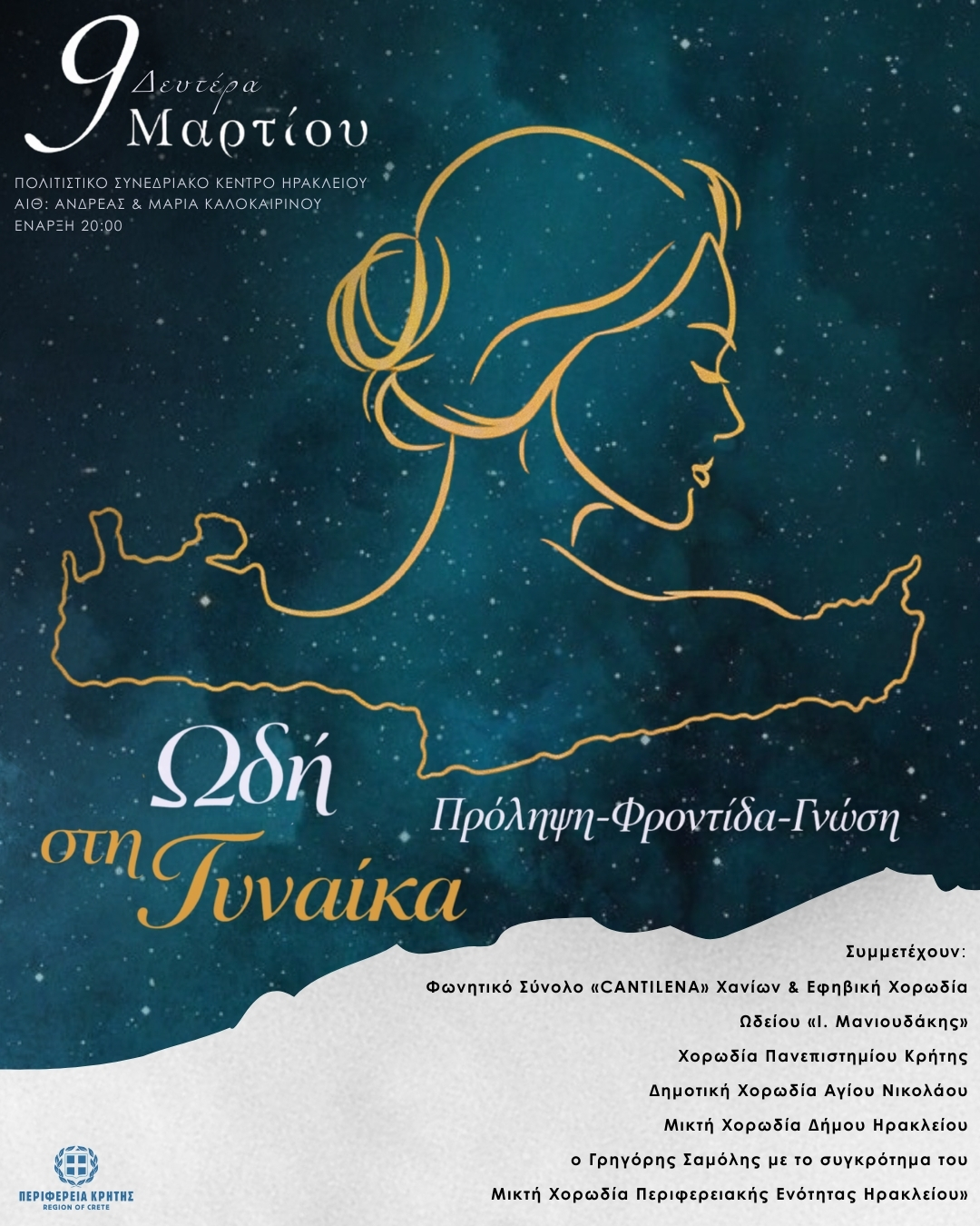 Η Περιφέρεια Κρήτης διοργανώνει τη Δευτέρα 9 Μαρτίου 2026 στις 20:00 εκδήλωση με θέμα «Πρόληψη – Φροντίδα – Γνώση. Ωδή στη Γυναίκα», με αφορμή την Παγκόσμια Ημέρα της Γυναίκας. Η εκδήλωση θα πραγματοποιηθεί στην αίθουσα Ανδρέα & Μαρία Καλοκαιρινού στο Πολιτιστικό Συνεδριακό Κέντρο Ηρακλείου, με στόχο την ανάδειξη της πρόληψης ως δικαίωμα, συνειδητή επιλογή και ουσιαστική στάση ζωής.