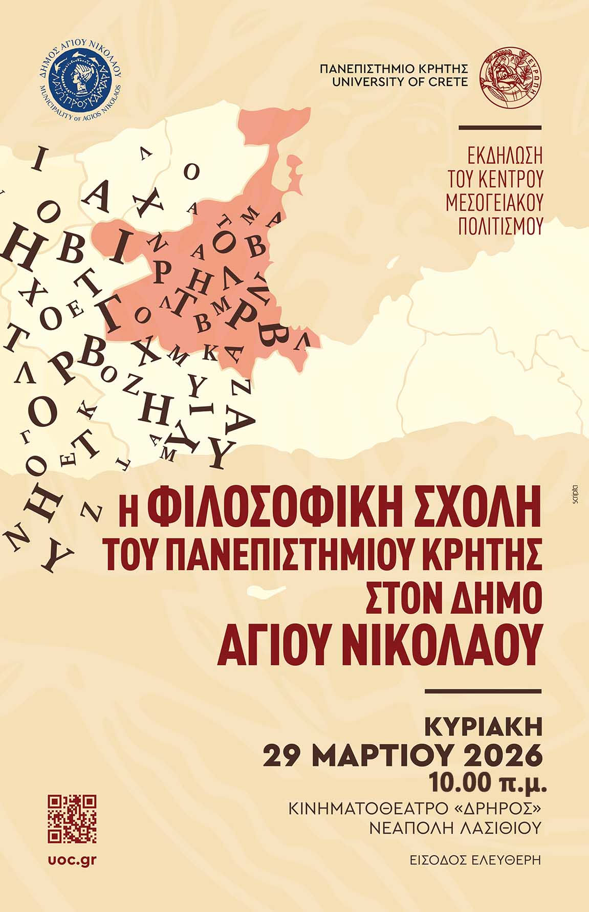 Το Πανεπιστήμιο Κρήτης διοργανώνει, σε συνεργασία με τον Δήμο Αγίου Νικολάου, εκδήλωση του Κέντρου Μεσογειακού Πολιτισμού στο Κινηματοθέατρο «Δρήρος», στη Νεάπολη Λασιθίου, την Κυριακή 29 Μαρτίου 2026, από τις 10.00 π.μ. έως τις 12.30 μ.μ., με ελεύθερη είσοδο.