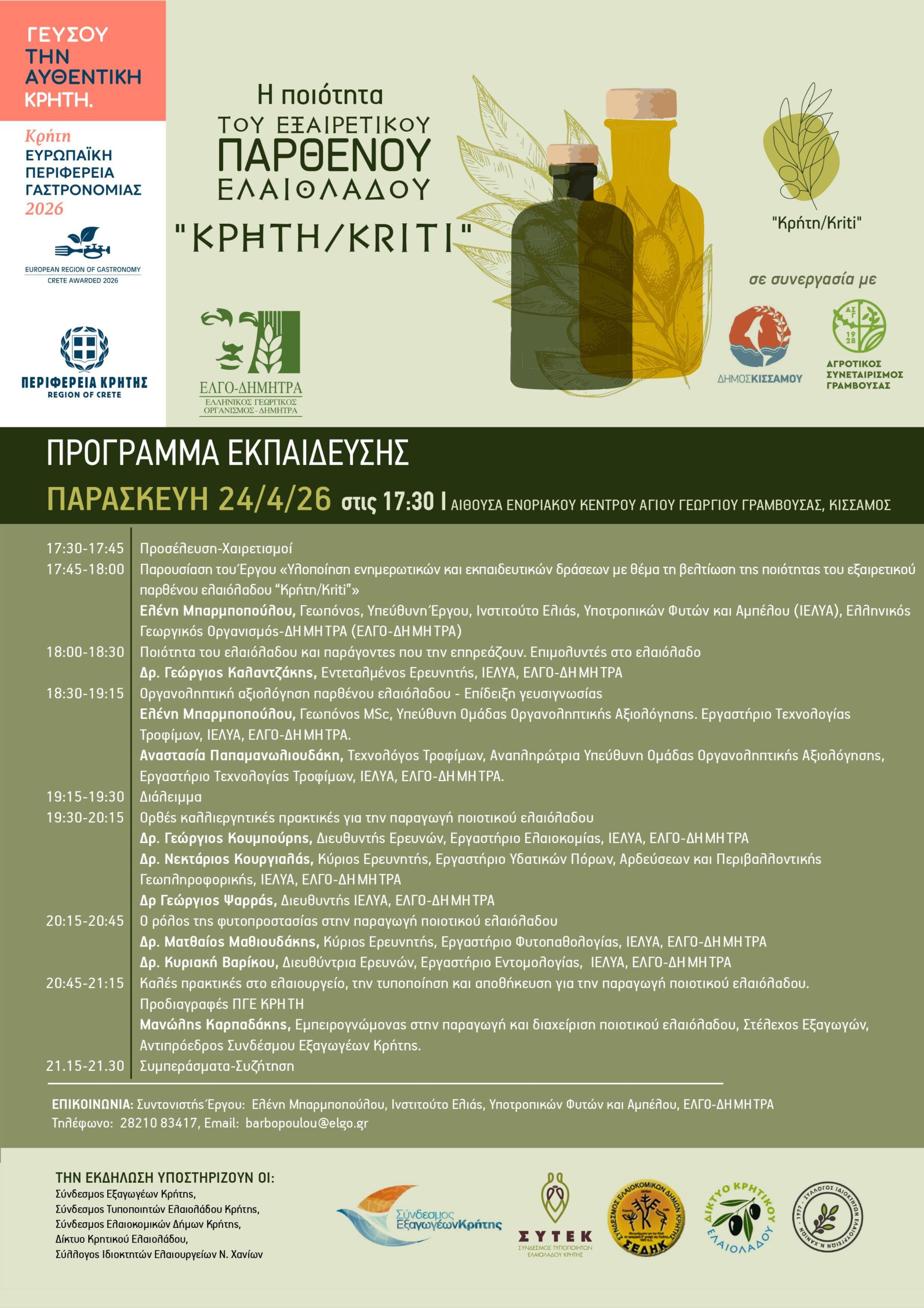 Η Περιφέρεια Κρήτης και ο ΕΛΓΟ-ΔΗΜΗΤΡΑ, σε συνεργασία με το Δήμο Κισσάμου και τον Αγροτικό Συνεταιρισμό Γραμβούσας, διοργανώνουν εσπερίδα για την ποιότητα του Εξαιρετικού Παρθένου Ελαιόλαδου «Κρήτη/Kriti», την Παρασκευή 24 Απριλίου 2026 στις 17:30 στην Αίθουσα Ενοριακού Κέντρου Αγίου Γεωργίου Γραμβούσας στην Κίσσαμο.