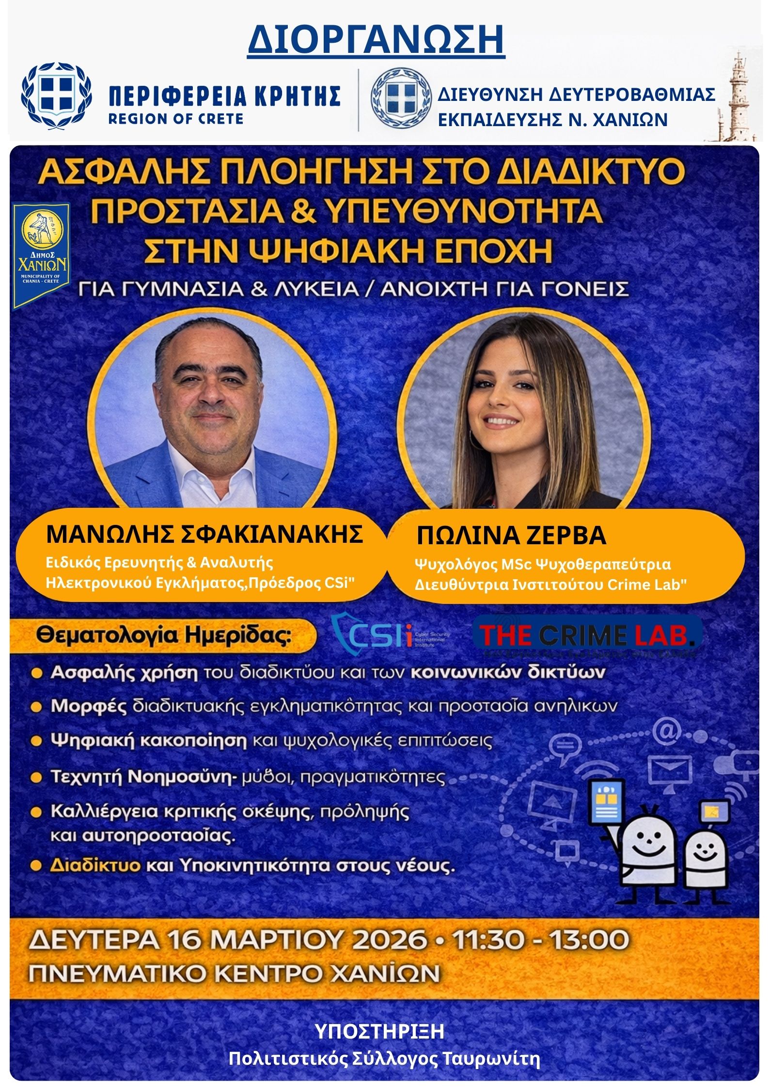 Η Διεύθυνση Δευτεροβάθμιας Εκπαίδευσης Χανίων σε συνεργασία με την Περιφέρεια Κρήτης – Περιφερειακή Ενότητα Χανίων, τον Δήμο Χανίων και τον Πολιτιστικό Σύλλογο Ταυρωνίτη διοργανώνουν εκπαιδευτική ημερίδα με θέμα «Ασφαλής Πλοήγηση στο Διαδίκτυο – Προστασία και Υπευθυνότητα στην Ψηφιακή Εποχή». Η εκδήλωση θα πραγματοποιηθεί τη Δευτέρα 16 Μαρτίου 2026, στις 11:30 το πρωί, στο Πνευματικό Κέντρο Χανίων.