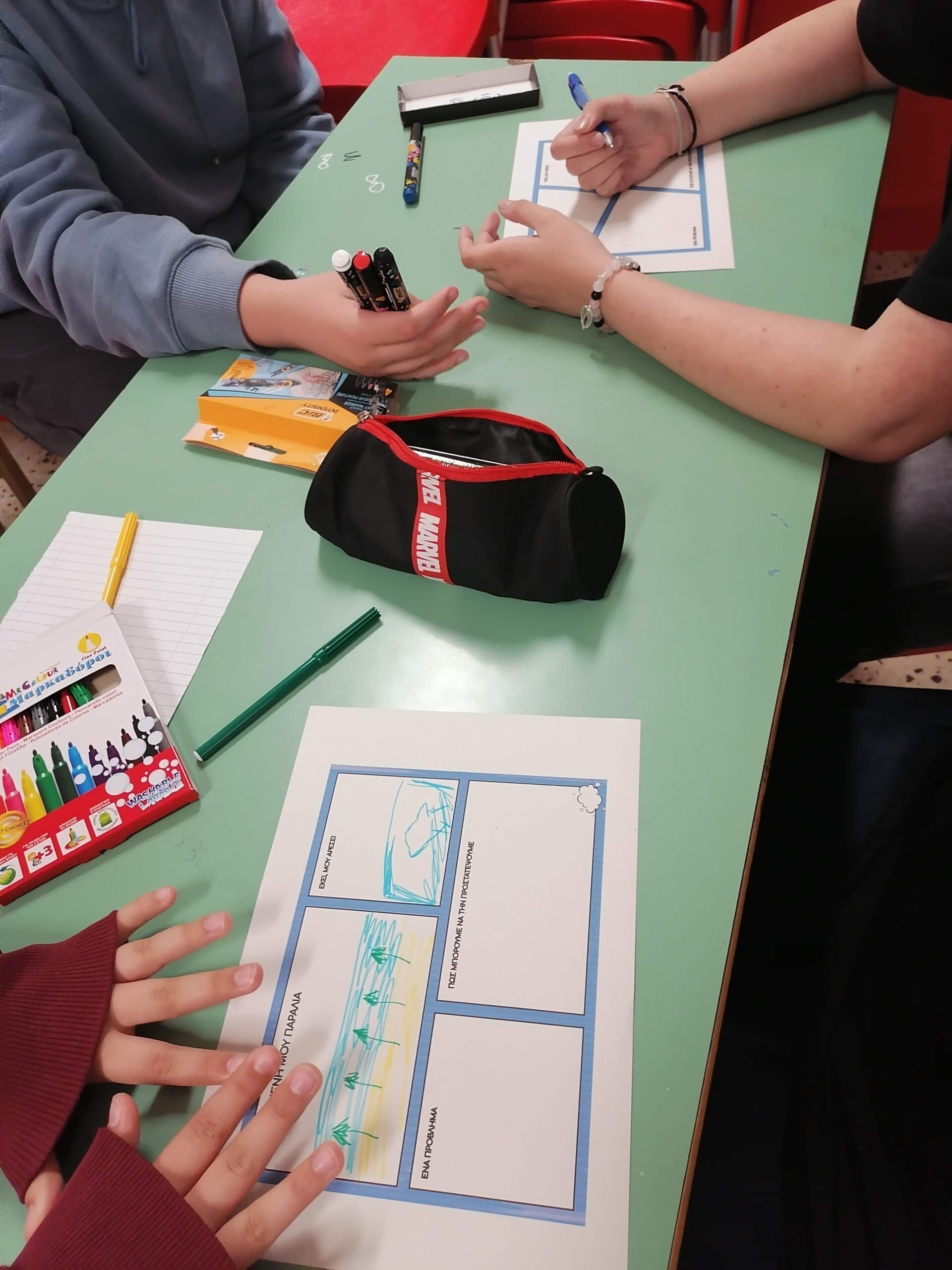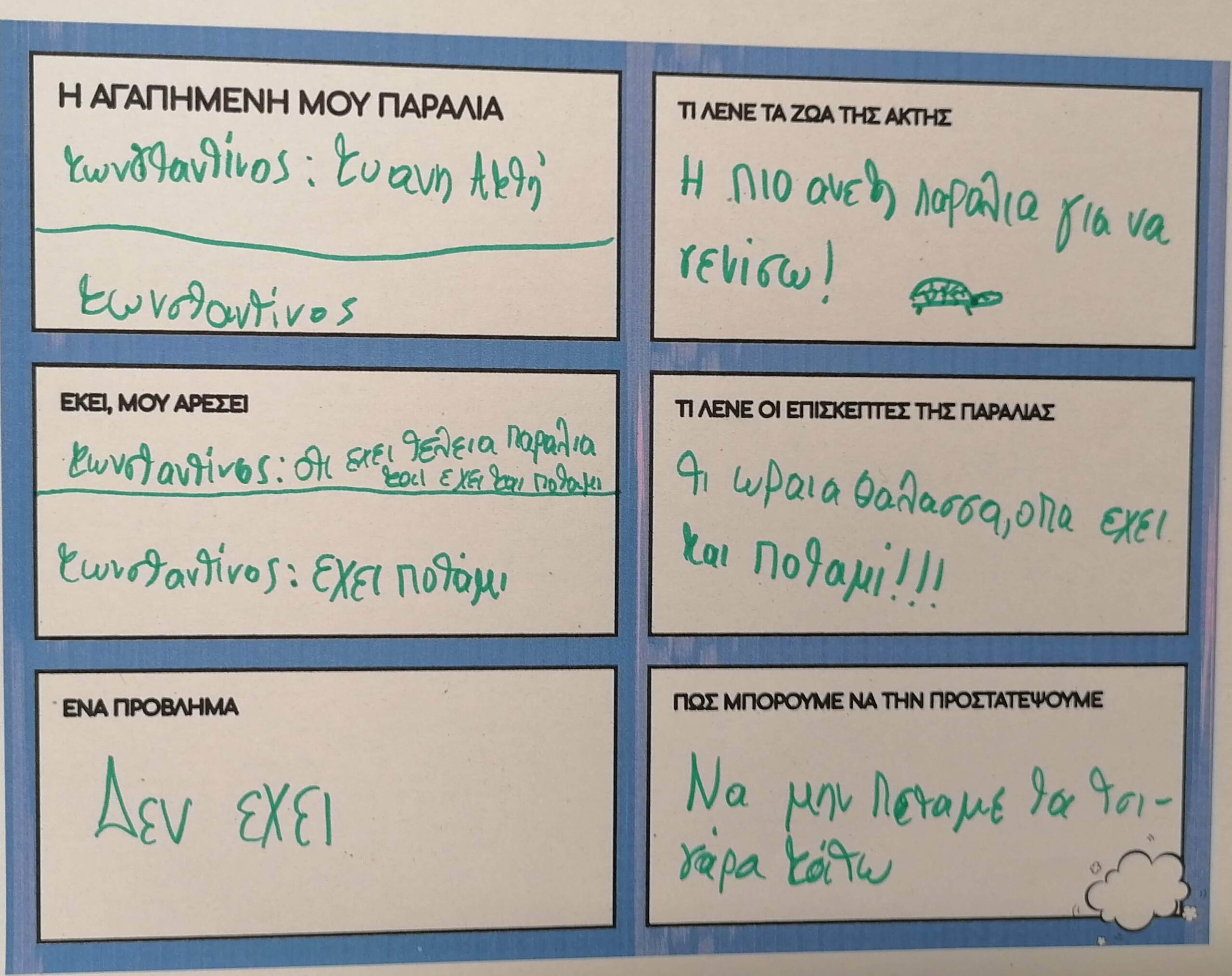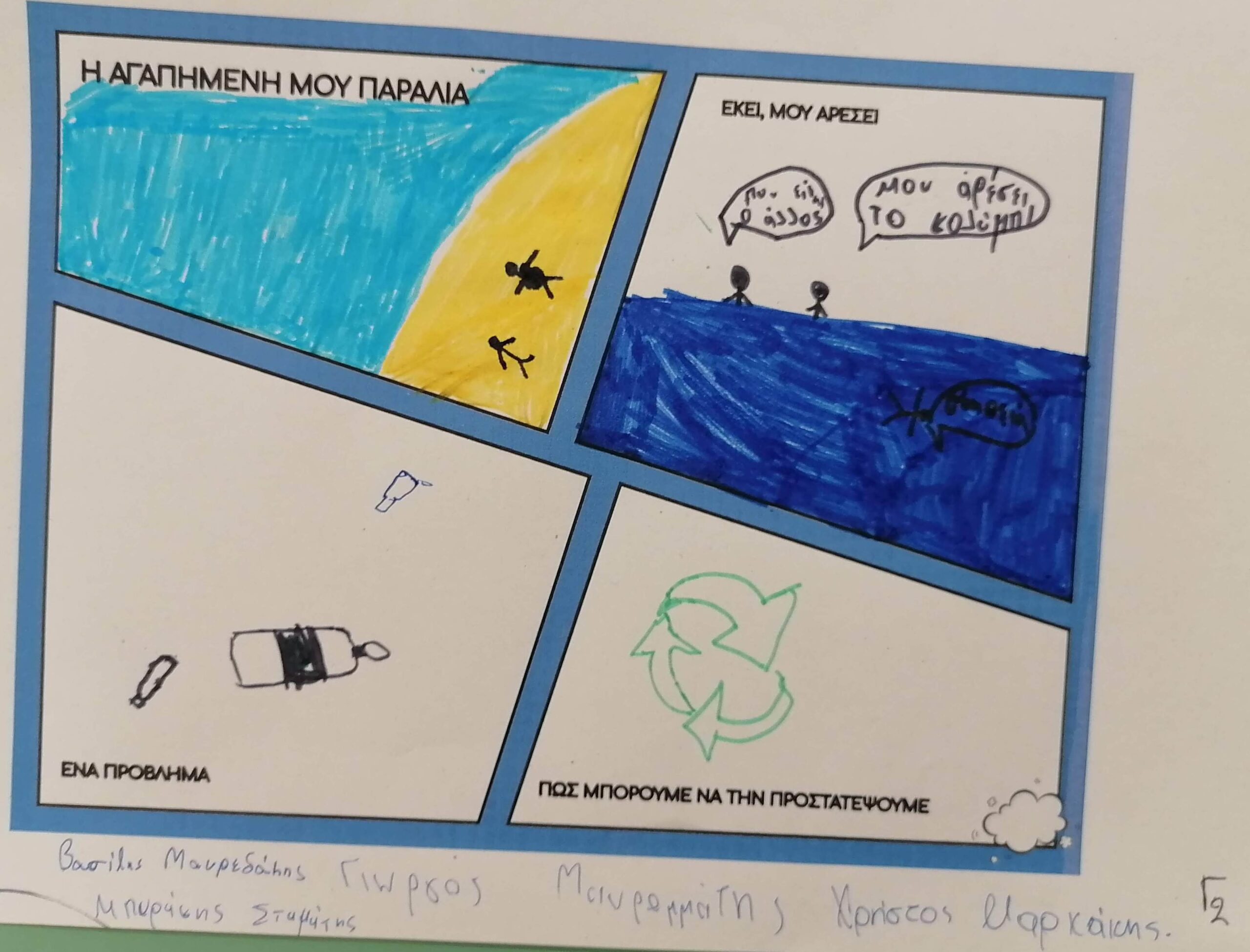 Οι μαθητές και οι μαθήτριες που συμμετείχαν δημιούργησαν, χωρισμένοι σε ομάδες, εικονογραφημένες ιστορίες και μαντινάδες σχετικά με τη θάλασσα και τις ακτές, εκφράζοντας με τη δική τους καλλιτεχνική ματιά τις ιδέες και τις προτάσεις τους.