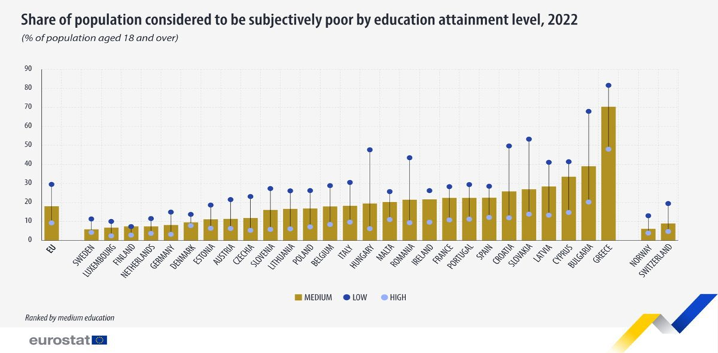 Ίσως, απάντηση στο ερώτημα να δίνουν τα στοιχεία της Eurostat, βάσει των οποίων 4/5 συμπολίτες μας με χαμηλό μορφωτικό επίπεδο θεωρούνται υποκειμενικά φτωχοί, όταν ο ευρωπαϊκός μέσος όρος στην ίδια κατηγορία είναι 1/3. Θα πει κάποιος: Μάλλον φταίει που δεν είχαν «δομημένο βιογραφικό», αλά Κυρανάκη. Μπορεί… Ωστόσο, τα ίδια στοιχεία καταγράφουν ότι υποκειμενικά φτωχά θεωρούνται και άτομα με μεσαίο μορφωτικό επίπεδο (απολυτήριο Λυκείου), μα και οι τελειόφοιτοι ΑΕΙ με τα ποσοστά να ανέρχονται σε 70% και 49% αντίστοιχα.
