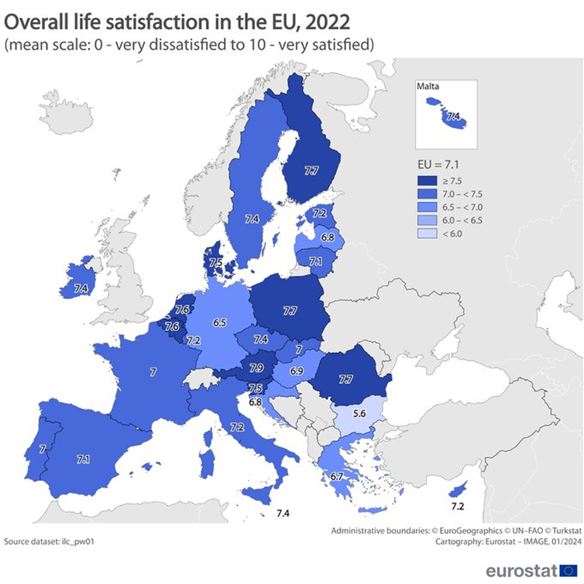 Και μπορεί «η φτώχεια να ήθελε καλοπέραση» στις ασπρόμαυρες ταινίες περασμένων δεκαετιών, στη σύγχρονη Ελλάδα όμως, μάλλον φέρνει μιζέρια και κατήφεια. Καταφεύγοντας εκ νέου στα στοιχεία της Eurostat διαπιστώνουμε ότι βρισκόμαστε στον πάτο της λίστας με τους πιο ικανοποιημένους κατοίκους της Ευρωπαϊκής Ένωσης, με ποσοστό 6,7π. Χειρότερα από εμάς είναι μόνο η Γερμανία με 6,5π. και η Βουλγαρία με 5,6π.