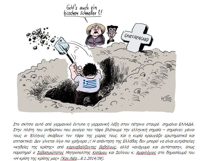 Παρένθεση: Περιέργως και ο πρώην Πρωθυπουργός κ. Κώστας Σημίτης, σε άρθρο του στο «ΒΗΜΑ της Κυριακής» (4. Ιαν. 2014) αναφέρει ότι στη Γερμανία και σε άλλες χώρες ζητούν την αποχώρηση της Ελλάδας από την Ευρωζώνη και προσθέτει: «Το σενάριο της Ιφιγένειας, η Ελλάδα να θυσιασθεί για να επανέλθει “ούριος άνεμος” στην Ευρωζώνη, παραμένει πιθανό». Ο ίδιος ο κ. Σημίτης, ο πρωταγωνιστής της ένταξής μας στην Ευρωζώνη, θεωρεί λοιπόν πιθανή την έξοδο της Ελλάδας από την Ευρωζώνη – οποία τραγικότητα!