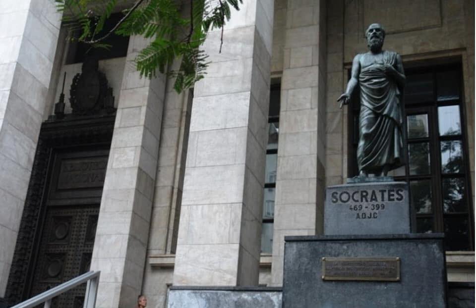 Εξω από τη Εθνική Βιβλιοθήκη του Μοντεβιδέο, ένα κτήριο βασισμένο σε Δωρικό ρυθμό έχει από έξω, δίπλα στην είσοδο, το άγαλμα του Σωκράτη.