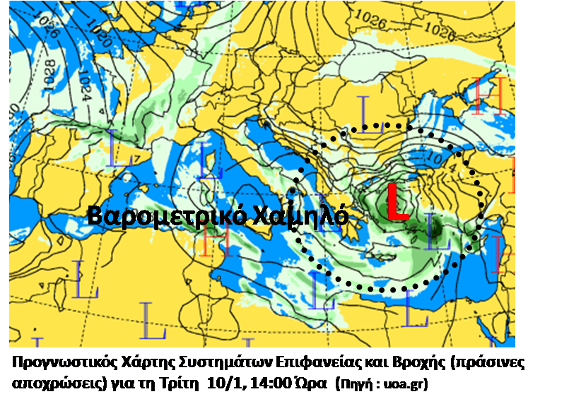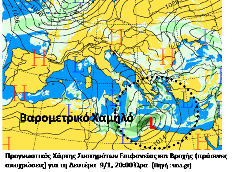 Με τα νεότερα στοιχεία των προγνωστικών μοντέλων, ένα νέο Βαρομετρικό χαμηλό οργανώνεται στις ακτές της Β. Αφρικής και εμπλουτίζεται με πολύ υγρασία. Το Χαμηλό αυτό θα κινηθεί γρήγορα βορειότερα, προς την Κρήτη, και αναμένεται να αλλάξει και πάλι το σκηνικό του καιρού (συνημμένα εικόνες κίνησης του Βαρομετρικού χαμηλού). Από τις βραδινές ώρες της Δευτέρας θα ξεκινήσουν οι βροχές από τα νότια του νησιού, ενώ πολύ γρήγορα, τις νυκτερινές ώρες και πρωινές ώρες της Τρίτης θα επικρατούν βροχοπτώσεις σε ολόκληρη την Κρήτη. Οι βροχές κατά τόπους θα είναι έντονες, ενώ υπάρχει πιθανότητα εκδήλωσης και τοπικών καταιγίδων. Χιονοπτώσεις αξιοσημείωτης έντασης αναμένεται να σημειωθούν κυρίως στα ορεινά (εκτιμάται ένα μέσο ενδεικτικό υψόμετρο τα 700 με 1000 μέτρα). Τα φαινόμενα αυτά αναμένεται να υποχωρήσουν γρήγορα, λόγω της μετακίνησης του Βαρομετρικού Χαμηλού προς τα Βορειοανατολικά, αποκαθιστώντας σταδιακά ένα καλύτερο σκηνικό του καιρού από νωρίς τις μεσημβρινές ώρες της Τρίτης.