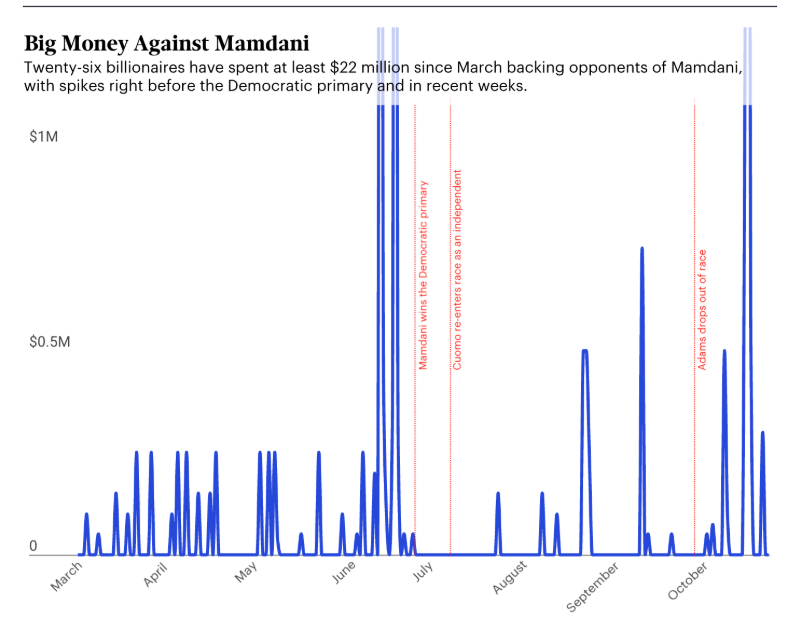 Συγκεκριμένα, το Forbes αναφέρει ότι ο διαχειριστής hedge fund Ackman όντως επένδυσε 1,75 εκατομμύρια δολάρια σε πολιτικές ομάδες που δαπανούν χρήματα εναντίον του Μαμντάνι, μέχρι τις 22 Οκτωβρίου, ενώ ο κληρονόμος της εταιρείας καλλυντικών Lauder έχει συνεισφέρει άλλα 750.000 δολάρια. Συνολικά, αυτοί οι δισεκατομμυριούχοι έχουν δωρίσει πάνω από 22 εκατομμύρια δολάρια για να υποστηρίξουν τις εκστρατείες της αντιπολίτευσης. Περίπου τα 13,6 εκατομμύρια δολάρια, δόθηκαν πριν ο Μαμντάνι κερδίσει τις προκριματικές εκλογές των Δημοκρατικών στις 24 Ιουνίου. Πάνω από τα μισά από αυτά δόθηκαν από τον πρώην δήμαρχο της Νέας Υόρκης Μάικλ Μπλουμπεργκ, ο οποίος υποστήριξε τον Κουόμο και χρηματοδότησε μια ομάδα που ονομάζεται Fix The City, Inc. με 8,3 εκατομμύρια δολάρια σε μετρητά τον Ιούνιο. Στην ίδια ομάδα δώρησαν ο συνιδρυτής της Netflix, Ριντ Χέιστινγκς, και ο επιχειρηματίας των μέσων ενημέρωσης, Μπάρι Ντίλερ, με το ποσό των 250.000 δολαρίων. Ορισμένοι συντηρητικοί δωρητές και σύμμαχοι του Trump έχουν επίσης εμπλακεί για να «μπλοκάρουν» τον Μαμντάνι, όπως ο μεγιστάνας των καζίνο, Στιβ Γουίν, ο οποίος δώρισε μισό εκατομμύριο δολάρια τον Οκτώβριο, και ο πετρελαϊκός μεγιστάνας, John Hess ο οποίος από τον Μάιο έχει διαθέσει συνολικά 1 εκατομμύριο δολάρια εναντίον του Μαμντάνι. Επίσης, ο συνιδρυτής της Airbnb, Τζο Γκέμπια, ο οποίος έχει ρόλο στην κυβέρνηση Τραμπ, επένδυσε 3 εκατομμύρια δολάρια σε τρεις διαφορετικές ομάδες κατά του Μαμντάνι μόνο στις 15 Οκτωβρίου.