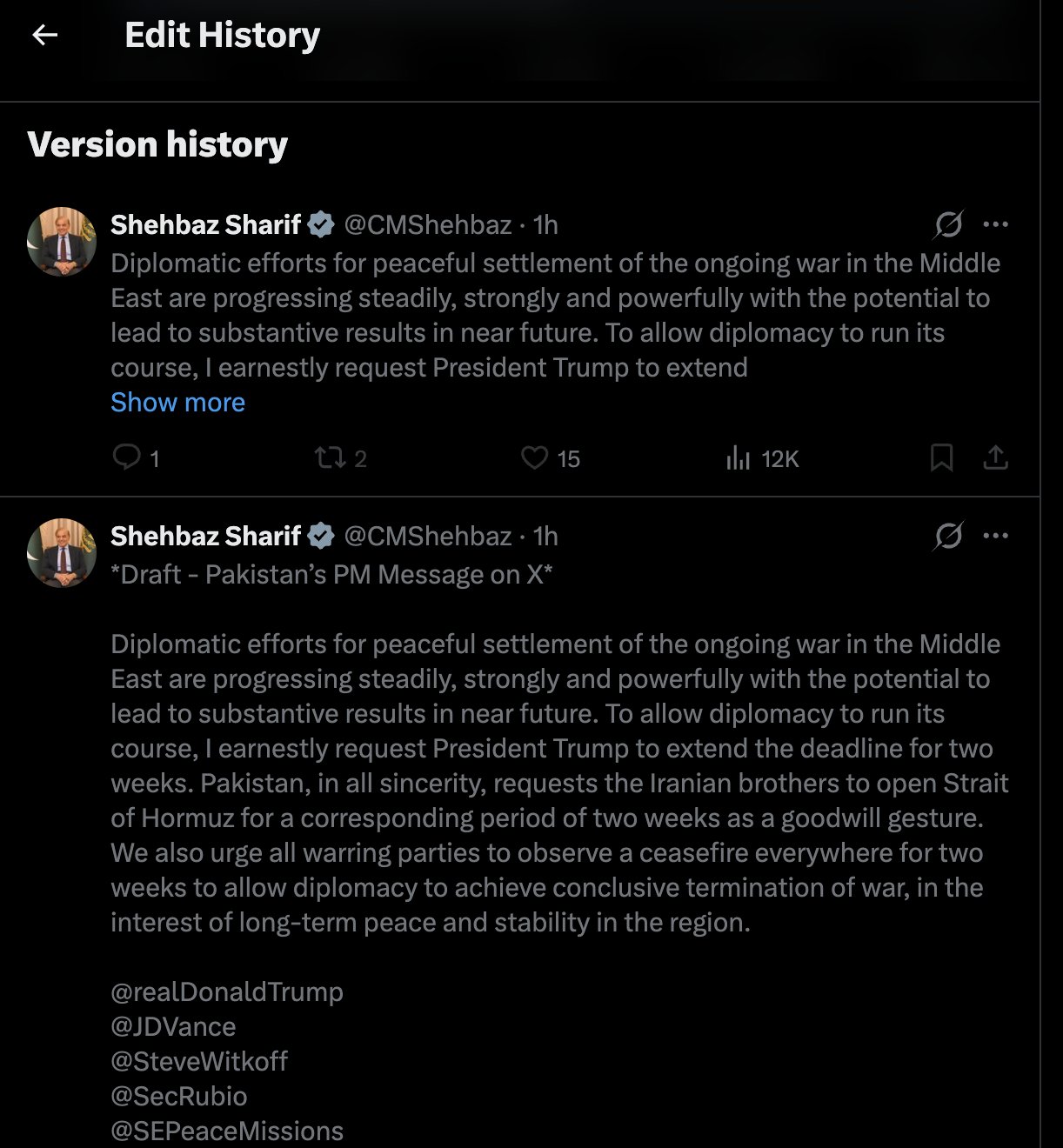 Oh, this is unbelievable. The edit history on this tweet shows that Pakistan Prime Minister Shehbaz Sharif originally copied and pasted everything he was sent, including: