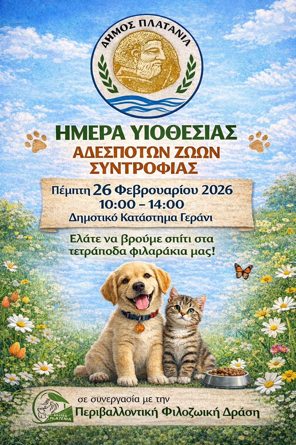 Ο Δήμος Πλατανιά σε συνεργασία με τη Φιλοζωική Περιβαλλοντική Δράση διοργανώνουν «Ημέρα Υιοθεσίας» την Πέμπτη 26 Φεβρουαρίου 2026, από τις 10:00 το πρωί έως τις 2:00 το μεσημέρι, στο Δημαρχείο Πλατανιά στο Γεράνι.