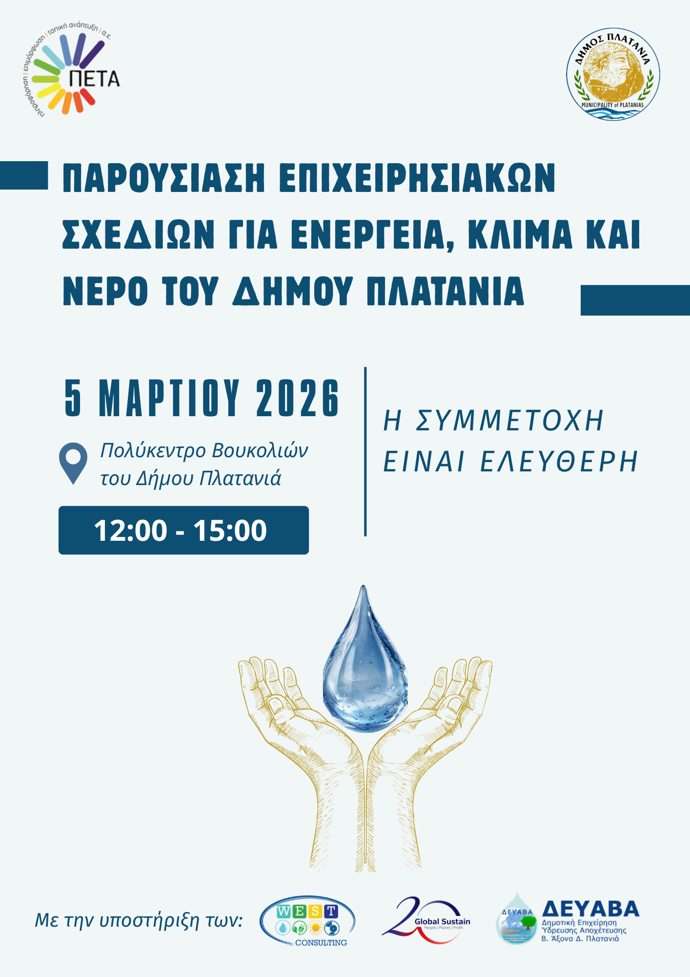 Την Πέμπτη 5 Μαρτίου 2026, ο Δήμος Πλατανιά διοργανώνει ημερίδα στο Πολύκεντρο Βουκολιών με θέμα την παρουσίαση των επιχειρησιακών σχεδίων για ενέργεια, κλίμα και νερό, στο πλαίσιο της στρατηγικής του για τη βιώσιμη ανάπτυξη και την προσαρμογή στην κλιματική αλλαγή.