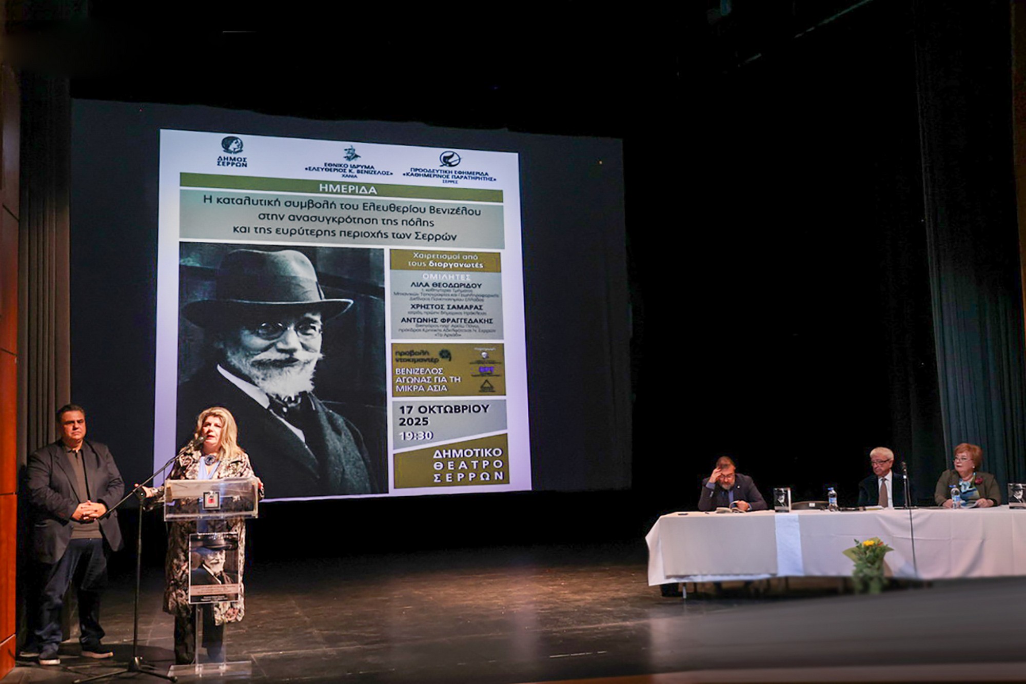 Στο κατάμεστο Δημοτικό Θέατρο Σερρών, την Παρασκευή 18 Οκτωβρίου, πραγματοποιήθηκε μια εξαιρετικά φορτισμένη και ιστορικά σημαντική εκδήλωση με θέμα τη συμβολή του Ελευθερίου Βενιζέλου στην ανασυγκρότηση της περιοχής των Σερρών κατά τον Μεσοπόλεμο.