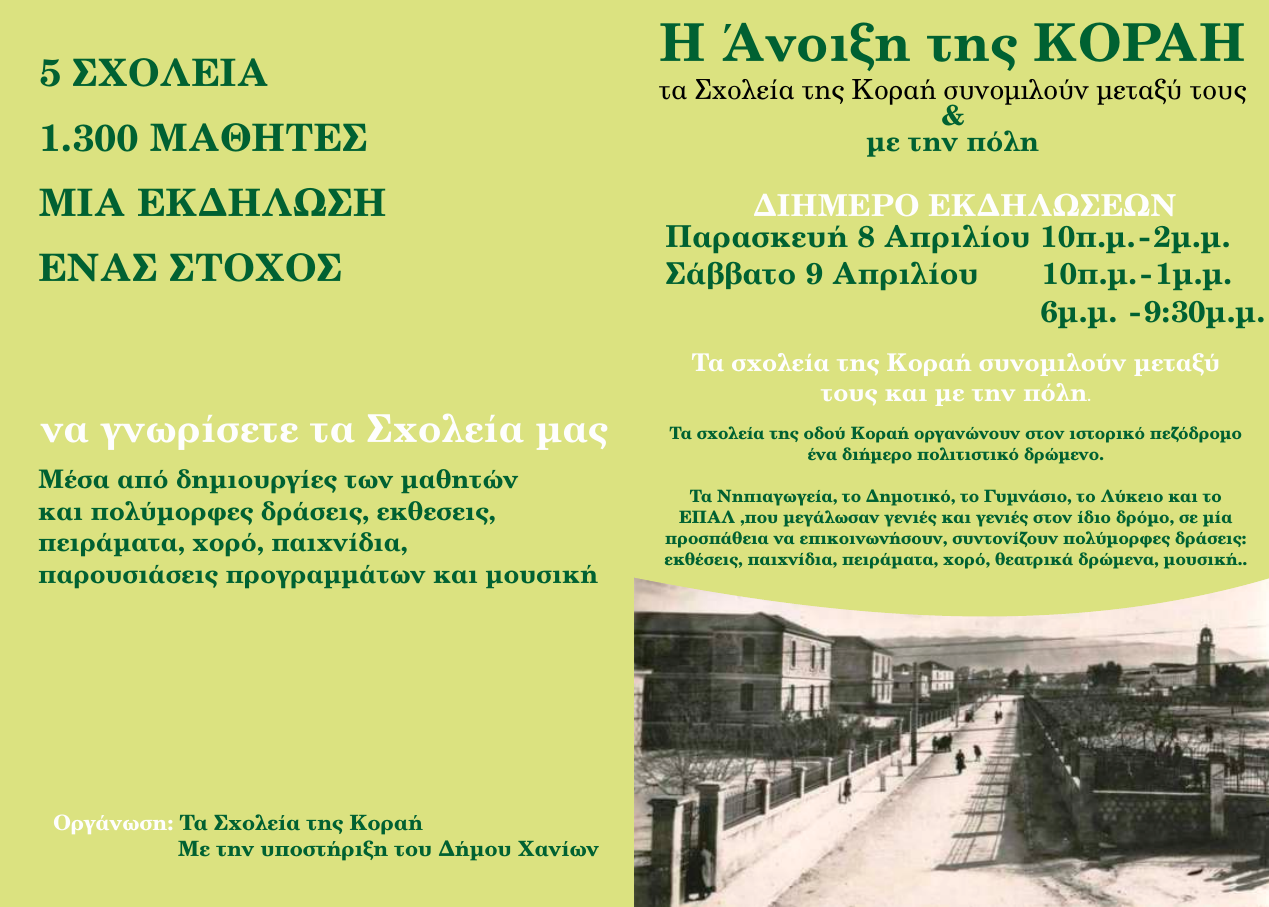 Tα σχολεία της οδού Κοραή οργανώνουν στον ιστορικό πεζόδρομο ένα διήμερο πολιτιστικό δρώμενο, την Παρασκευή και το Σάββατο 8 και 9 Απριλίου.