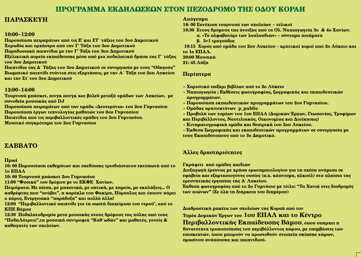 Τα Νηπιαγωγεία, το Δημοτικό, το Γυμνάσιο, το Λύκειο και το ΕΠΑΛ ,που μεγάλωσαν γενιές και γενιές στον ίδιο δρόμο, σε μία προσπάθεια να επικοινωνήσουν, συντονίζουν πολύμορφες δράσεις: εκθέσεις, παιχνίδια, πειράματα, χορό, θεατρικά δρώμενα, μουσική.