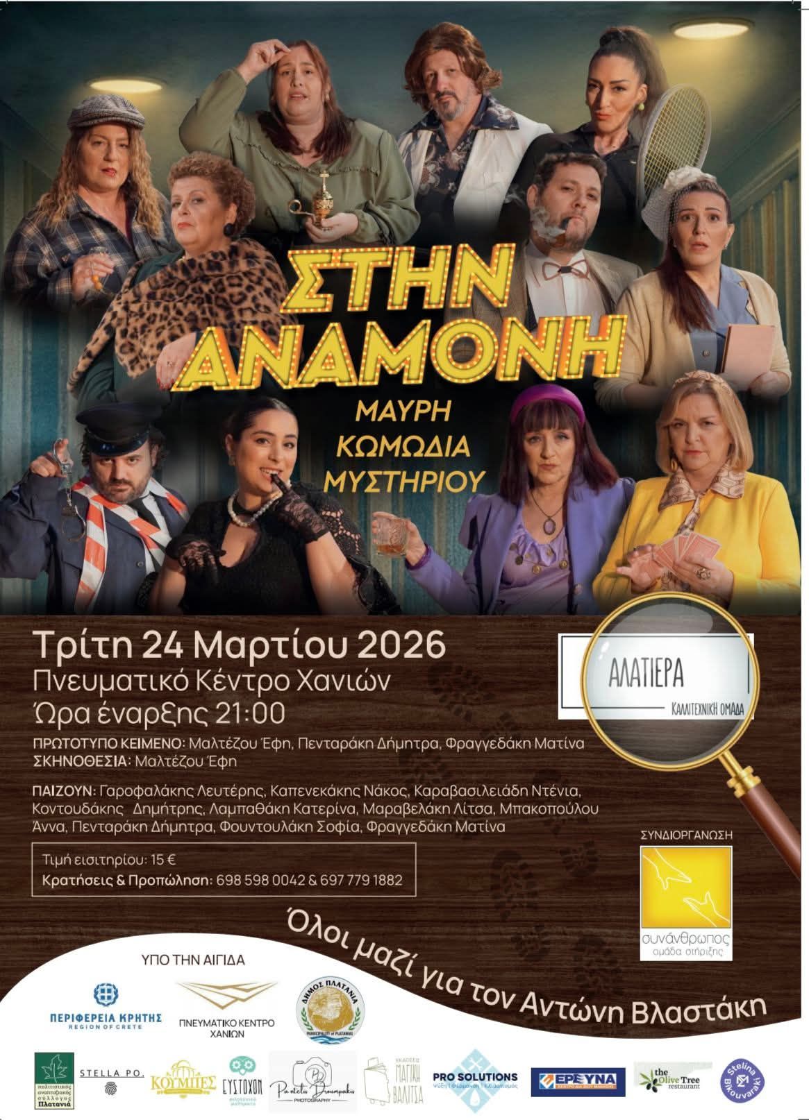 Η καλλιτεχνική ομάδα «Αλατιέρα» επανέρχεται στη σκηνή του Πνευματικού Κέντρου Χανίων την Τρίτη 24 Μαρτίου 2026, ανταποκρινόμενη στην αυξημένη ζήτηση του κοινού μετά τη μεγάλη επιτυχία της φετινής της παράστασης. Η μαύρη κωμωδία μυστηρίου «Στην Αναμονή» παρουσιάζεται για ακόμη μία φορά, αυτή τη φορά για καλό σκοπό.
