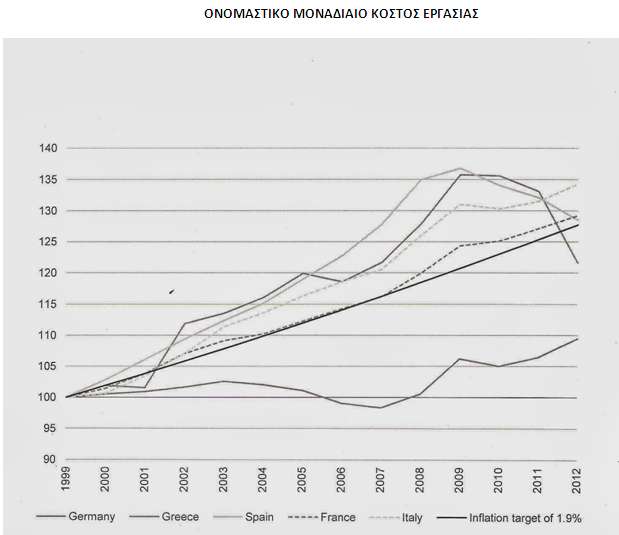 Το διάγραμμα που παραθέτω προέρχεται από μια μελέτη που έκανα το 2013 από κοινού με το Χάινερ Φλάσμπεκ για λογαριασμό του Ινστιτούτου Ρόζα Λούξεμπουργκ στη Γερμανία. Δείχνει τη μεταβολή του ονομαστικού μοναδιαίου κόστους εργασίας στη Γερμανία, τη Γαλλία, την Ιταλία, την Ελλάδα και την Ισπανία. Το ονομαστικό μοναδιαίο κόστος εργασίας είναι ο πλέον διαδεδομένος δείκτης ολικής, ή εθνικής, ανταγωνιστικότητας, διότι λαμβάνει υπόψη του τις αλλαγές στην παραγωγικότητα και εστιάζει στις αλλαγές του συνολικού κόστους εργασίας.