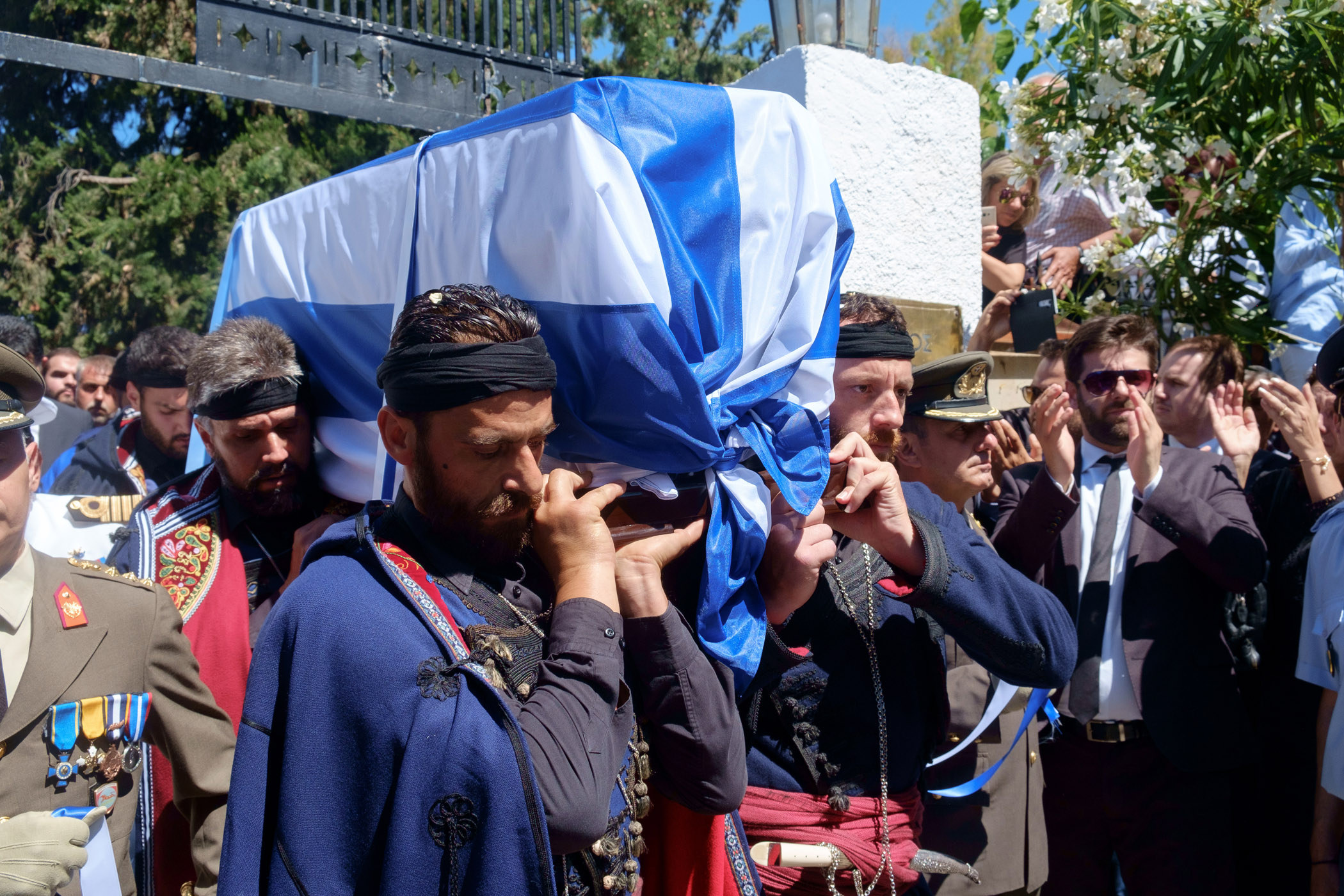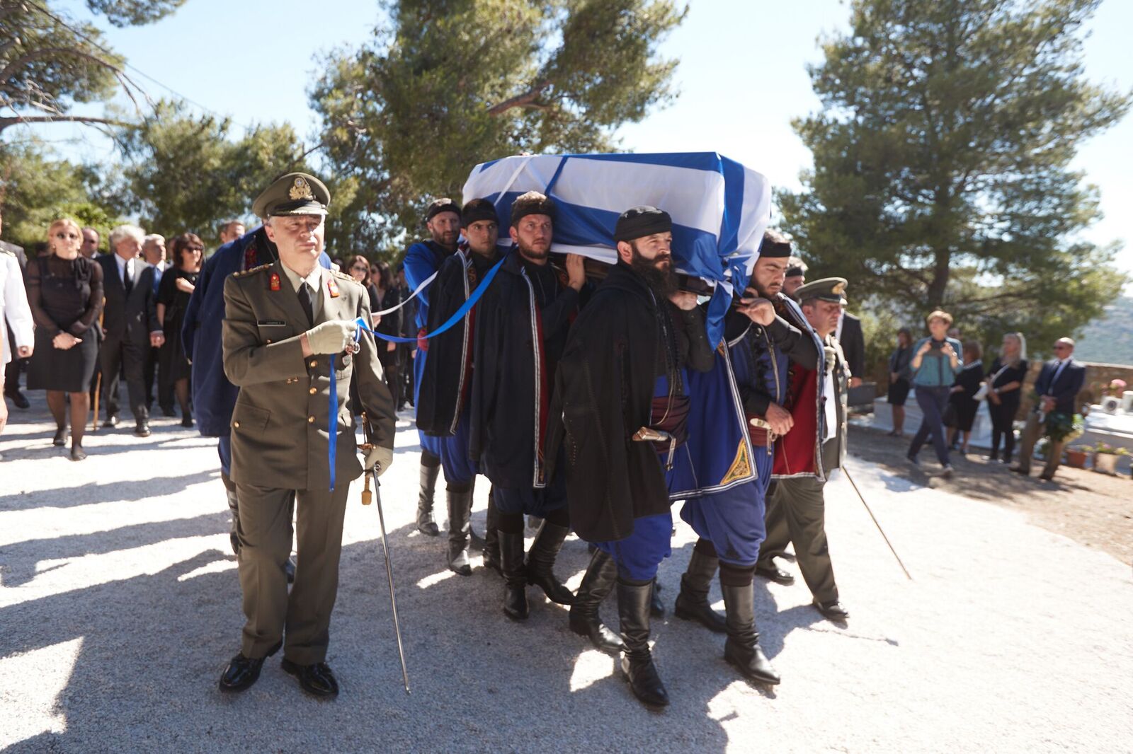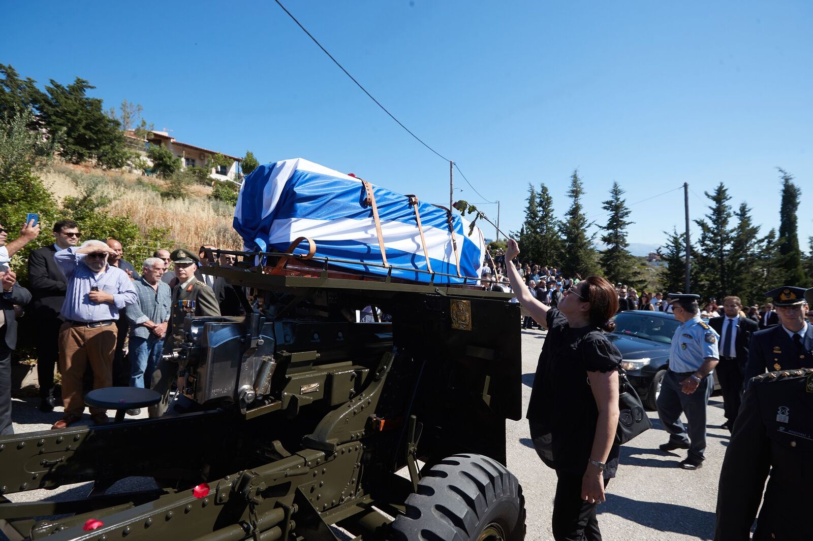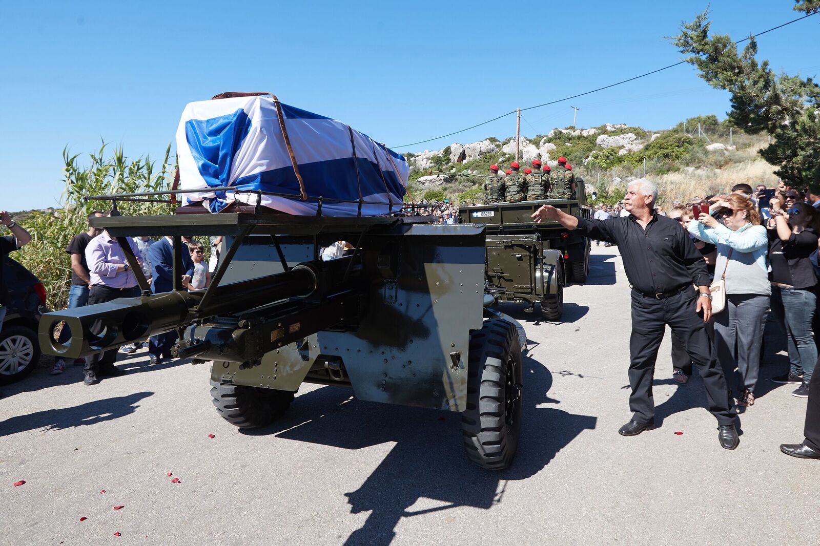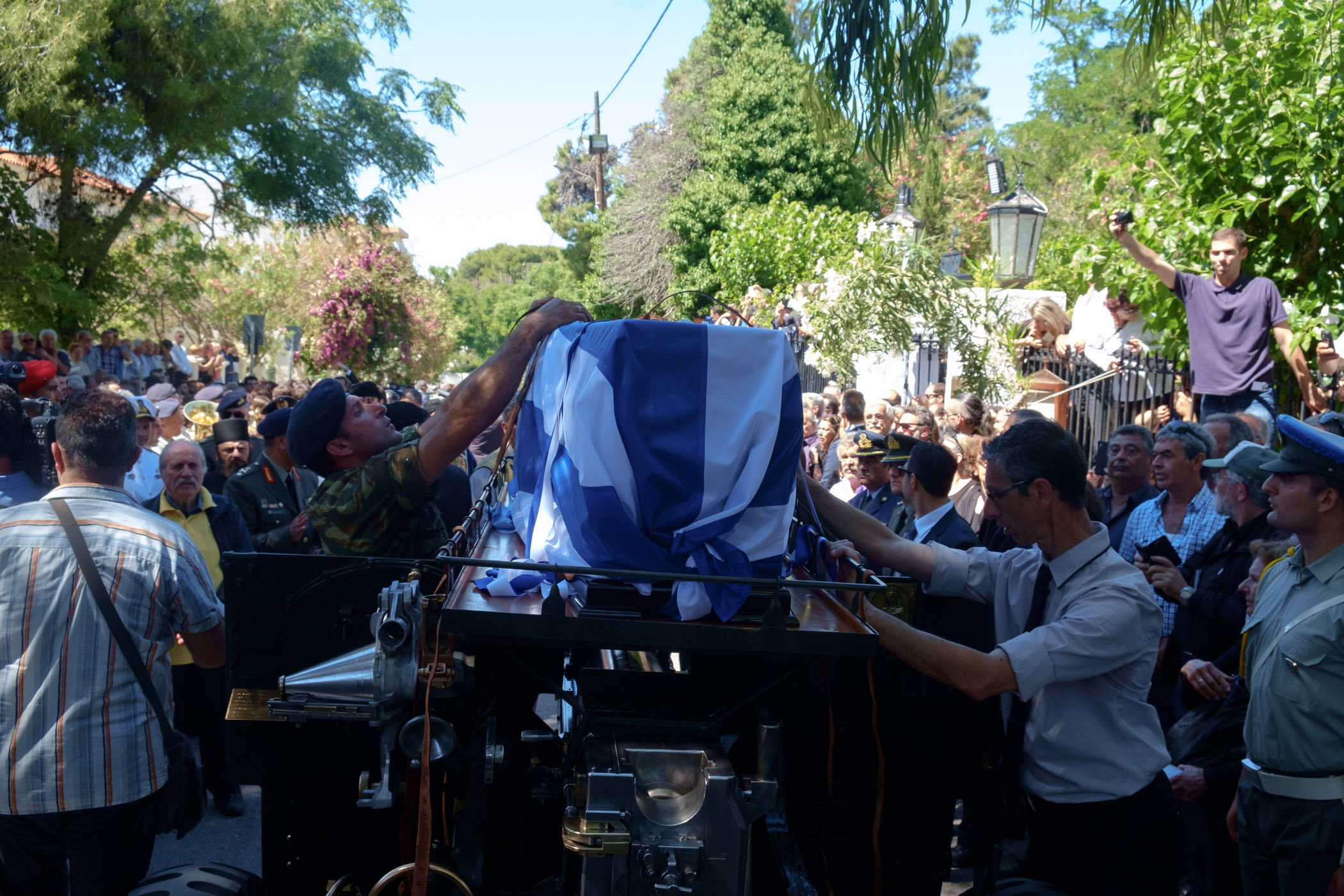 Βρακοφόροι πήραν στους ώμους τους το τυλιγμένο με την ελληνική σημαία φέρετρο και το επαπόθεσαν σε κιλλίβαντα πυροβόλου όπλου ενώ το συγκεντρωμένο πλήθος χειροκροτούσε.