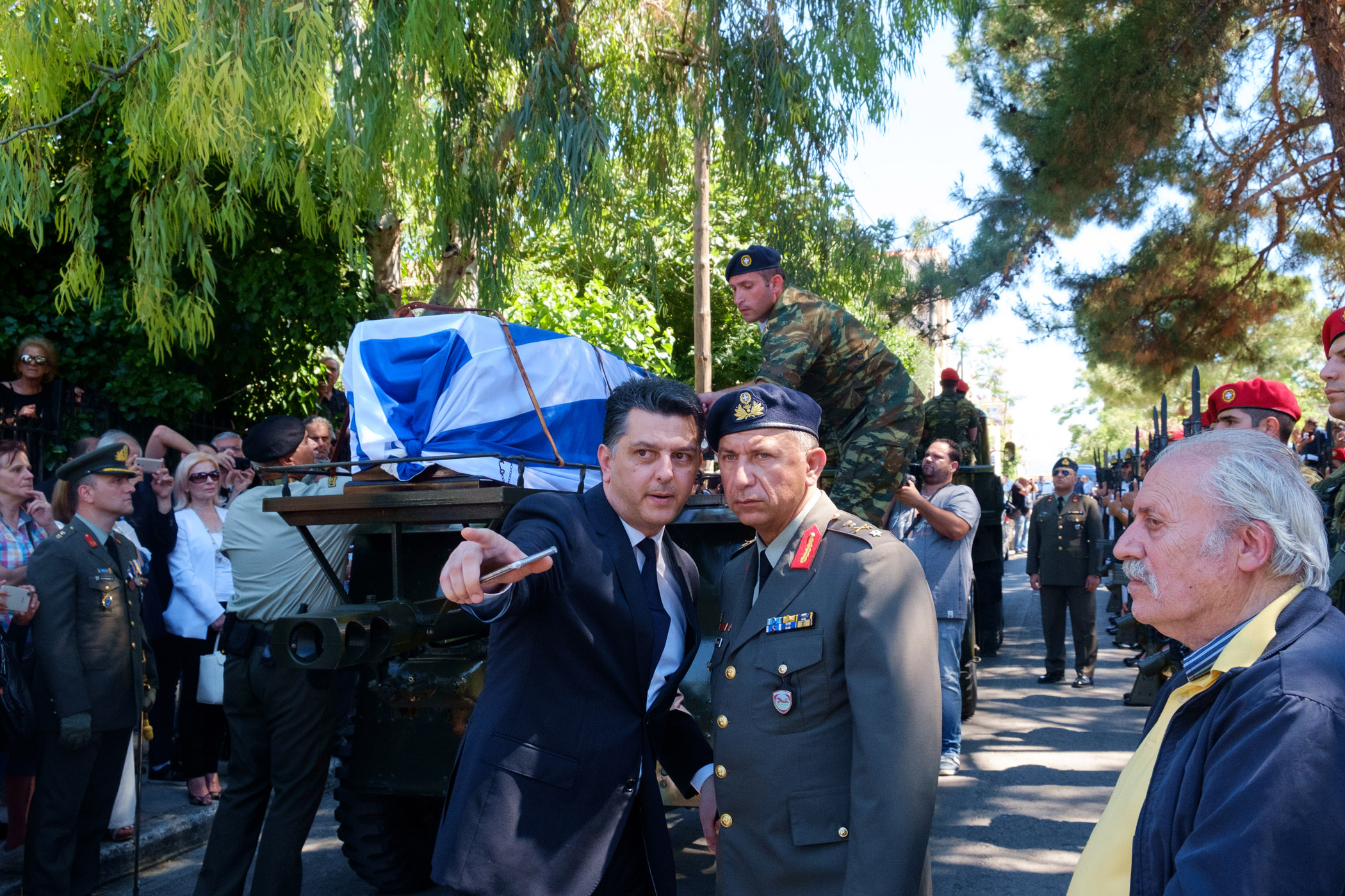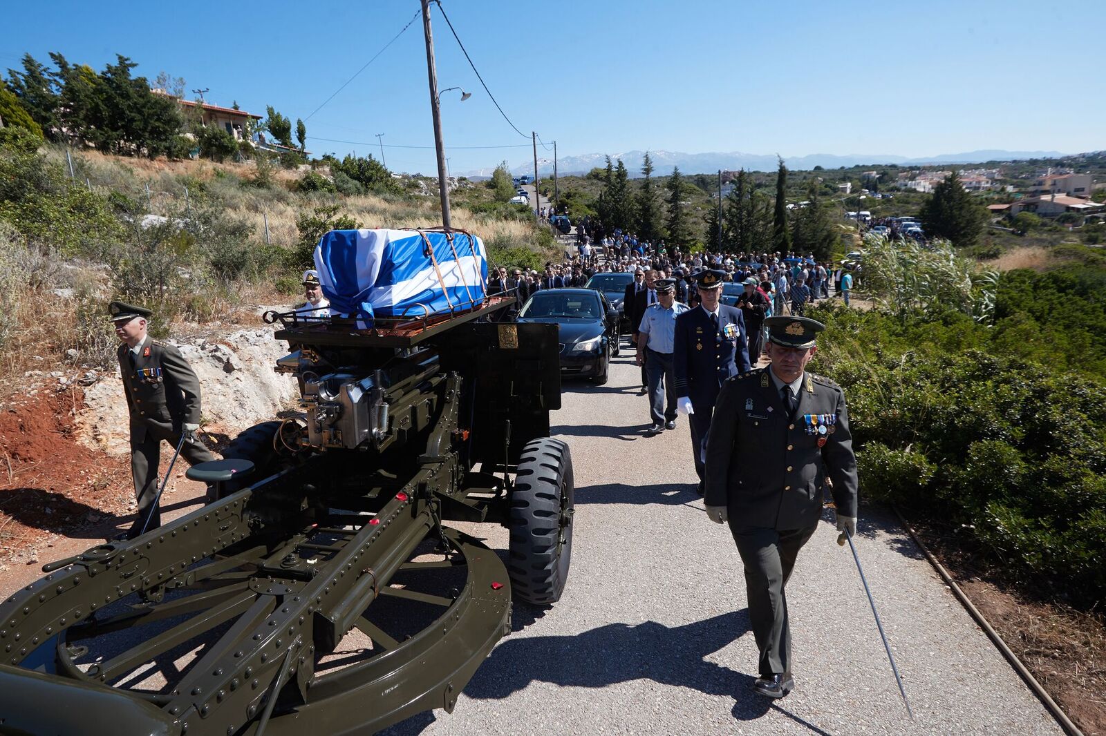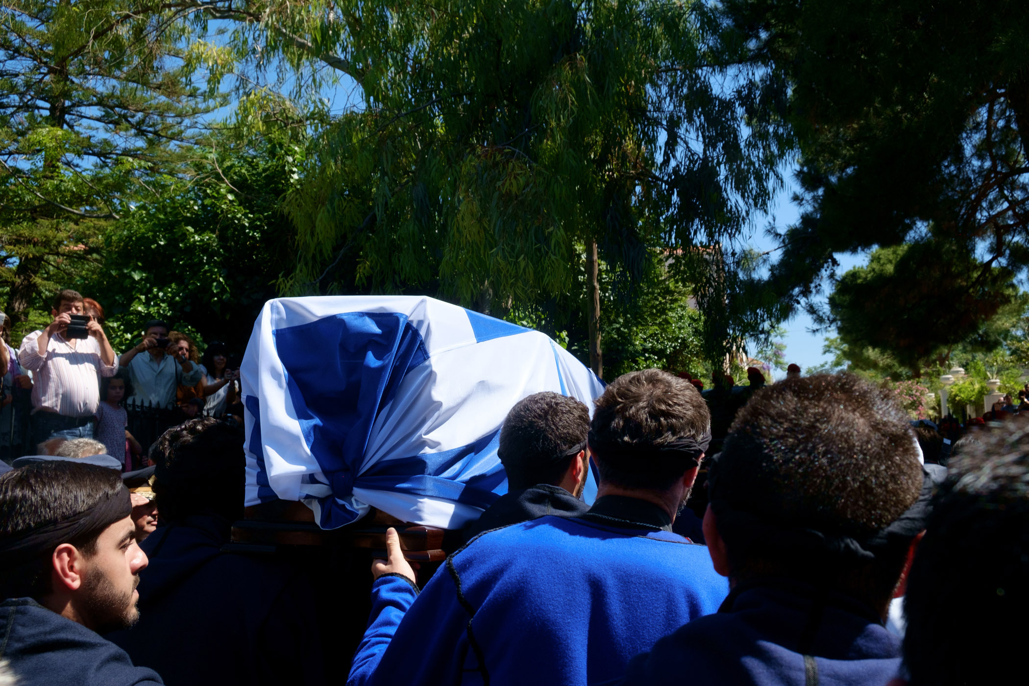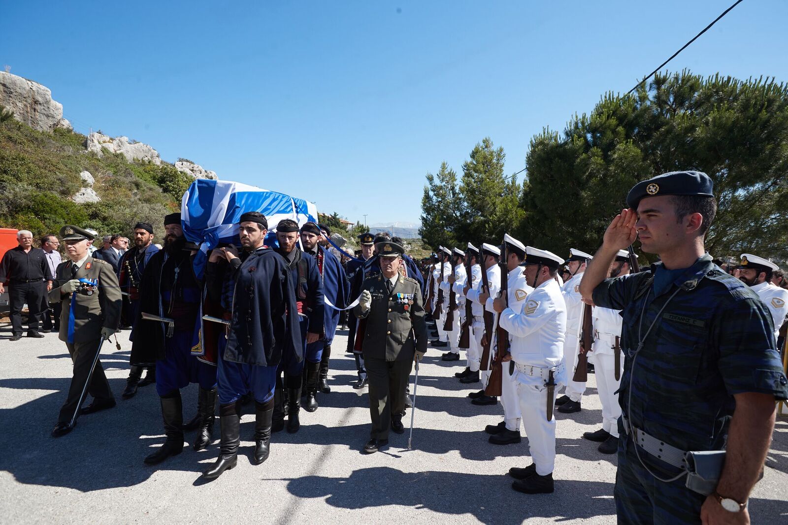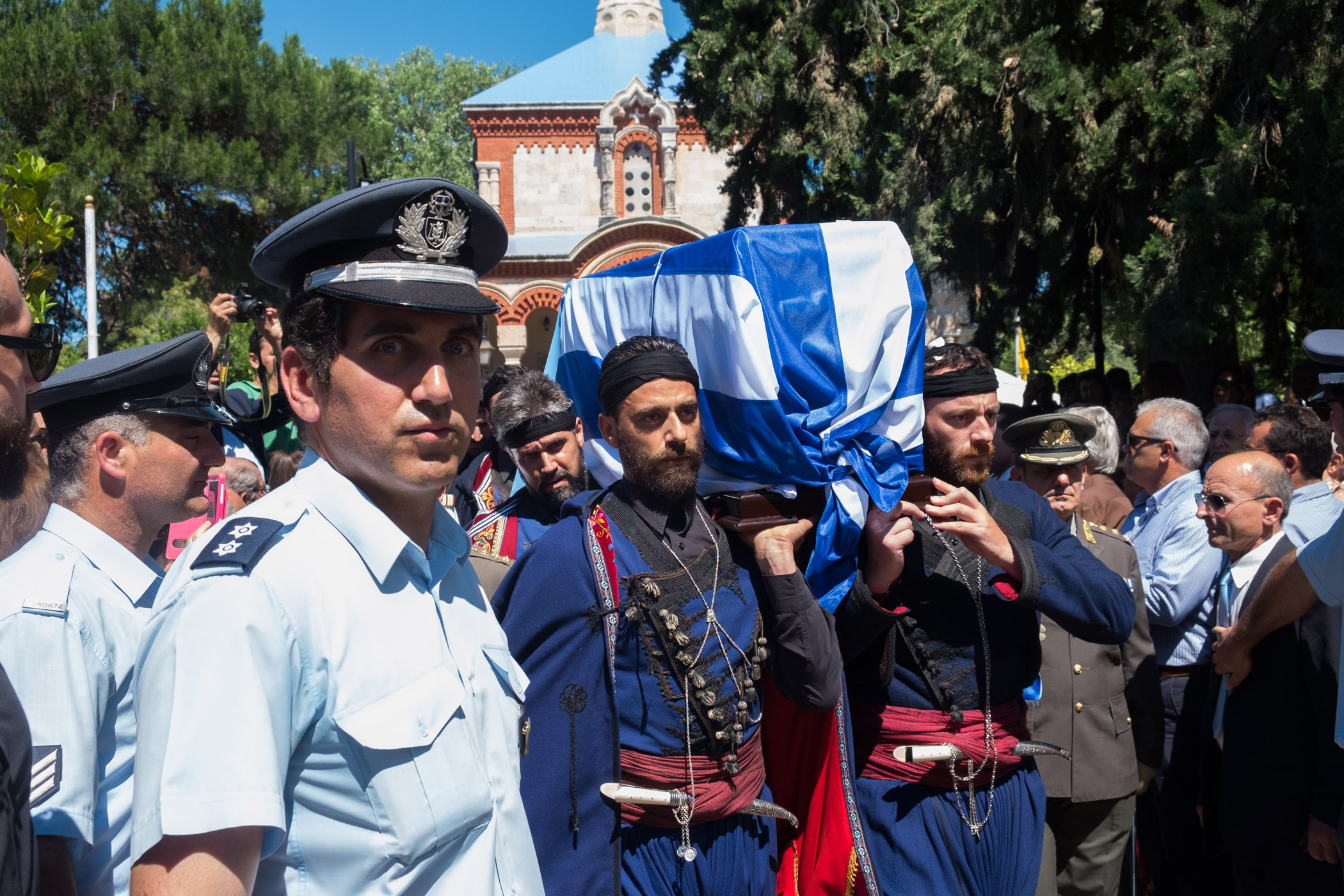 Βρακοφόροι πήραν στους ώμους τους το τυλιγμένο με την ελληνική σημαία φέρετρο και το επαπόθεσαν σε κιλλίβαντα πυροβόλου όπλου ενώ το συγκεντρωμένο πλήθος χειροκροτούσε.