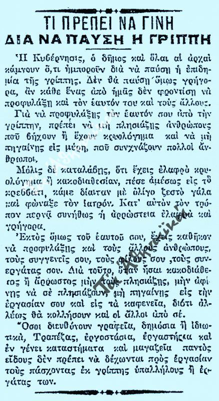 Οδηγίες αντιμετώπισης της “Ισπανικής Γρίπης” από το Ελληνικό Υπουργείο Εσωτερικών το 1918. Δεν υπάρχουν μεγάλες διαφορές από τις σημερινές.