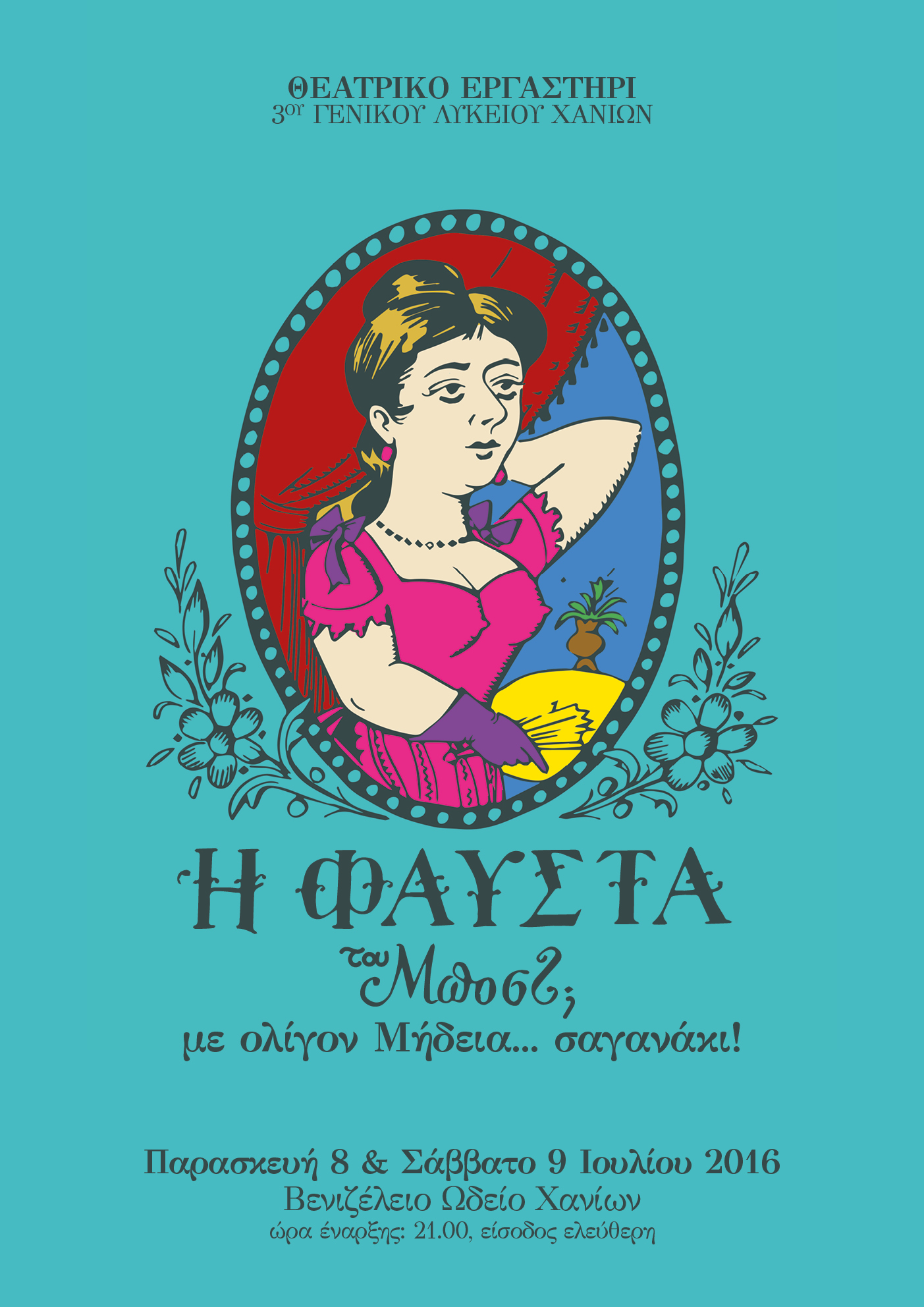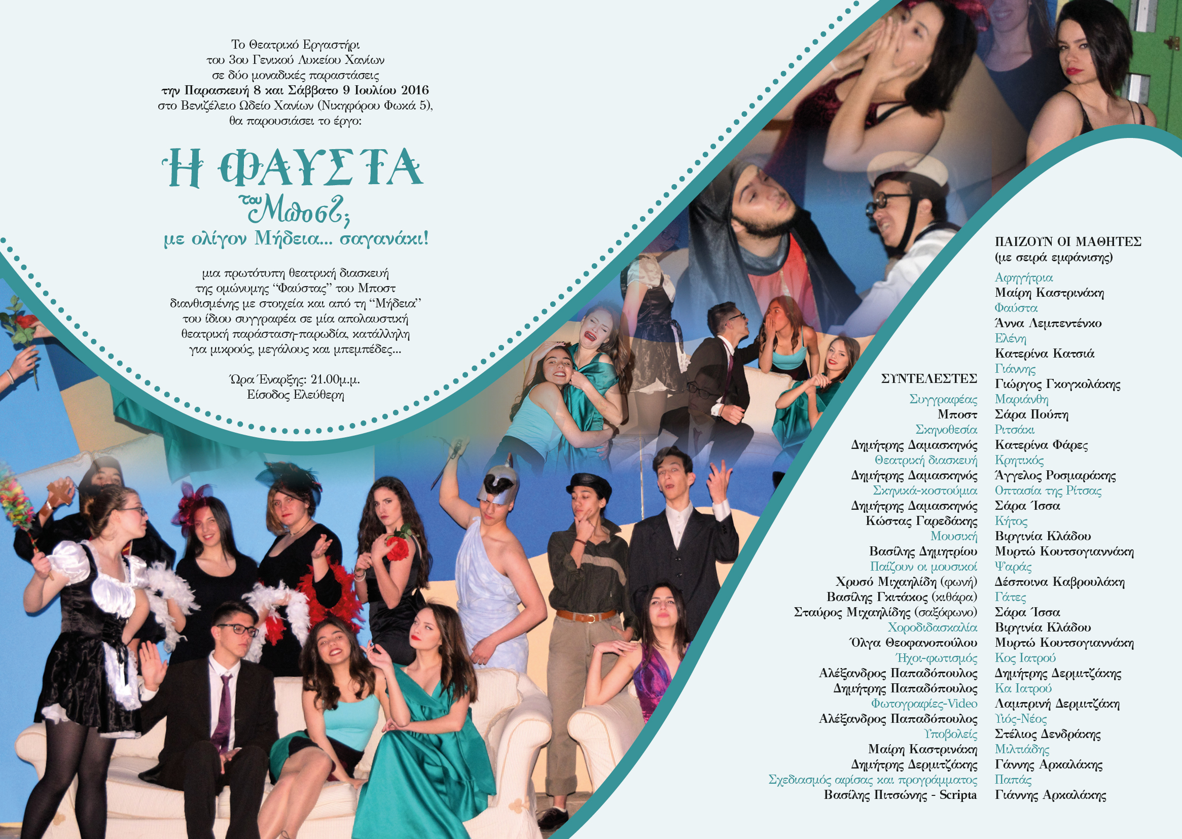 Το θεατρικό εργαστήρι του 3ου Γενικού Λυκείου Χανίων σε δύο μοναδικές παραστάσεις την Παρασκευή 8 και Σάββατο 9 Ιουλίου 2016 στο Βενιζέλειο Ωδείο Χανίων (Νικηφόρου Φωκά 5), θα παρουσιάσει το έργο: “Η Φαύστα του Μποστ (;) με ολίγον Μήδεια… σαγανάκι!”, μια πρωτότυπη δηλαδή θεατρική διασκευή της ομώνυμης “Φαύστας” του Μποστ διανθισμένης με στοιχεία και από τη “Μήδεια” του ίδιου συγγραφέα σε μία απολαυστική θεατρική παράσταση-παρωδία, κατάλληλη για μικρούς, μεγάλους και μπεμπέδες…