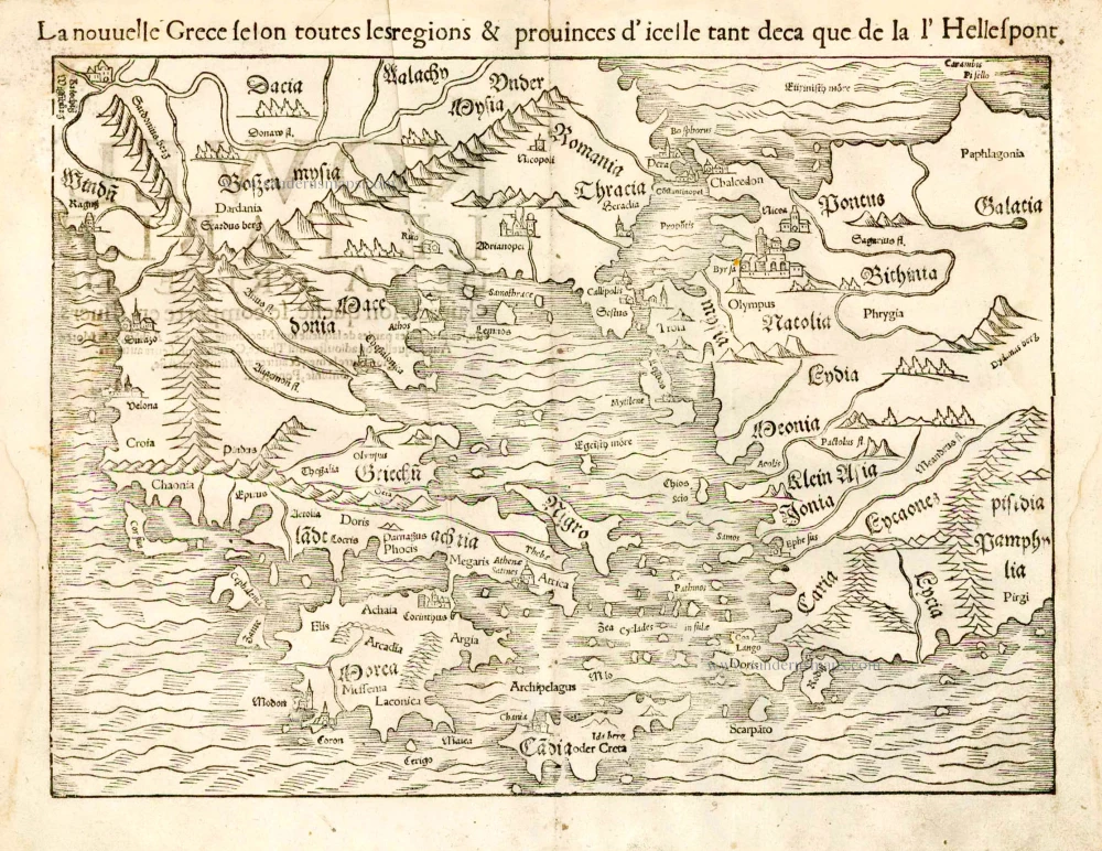 Antique map of Greece – Aegean Sea – Turkey by Munster S, 1552,