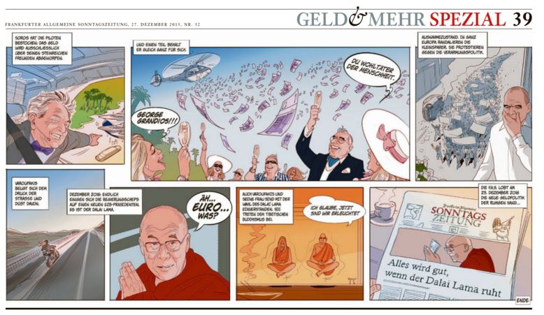 Μπορεί ο Γιάνης Βαρουφάκης να έχει αποχωρήσει από την ενεργό πολιτική δράση, οι Γερμανοί όμως δεν τον ξεχνάνε έτσι εύκολα. Με ένα ειρωνικό κόμικ η εφημερίδα Frankfurter Allgemeine Zeitung (FAZ) ξαναχτυπά, κάνοντας τον Βαρουφάκη κόμικ αλλά και επικεφαλής της ΕΚΤ για να τον στείλει τελικά στο Θιβέτ.