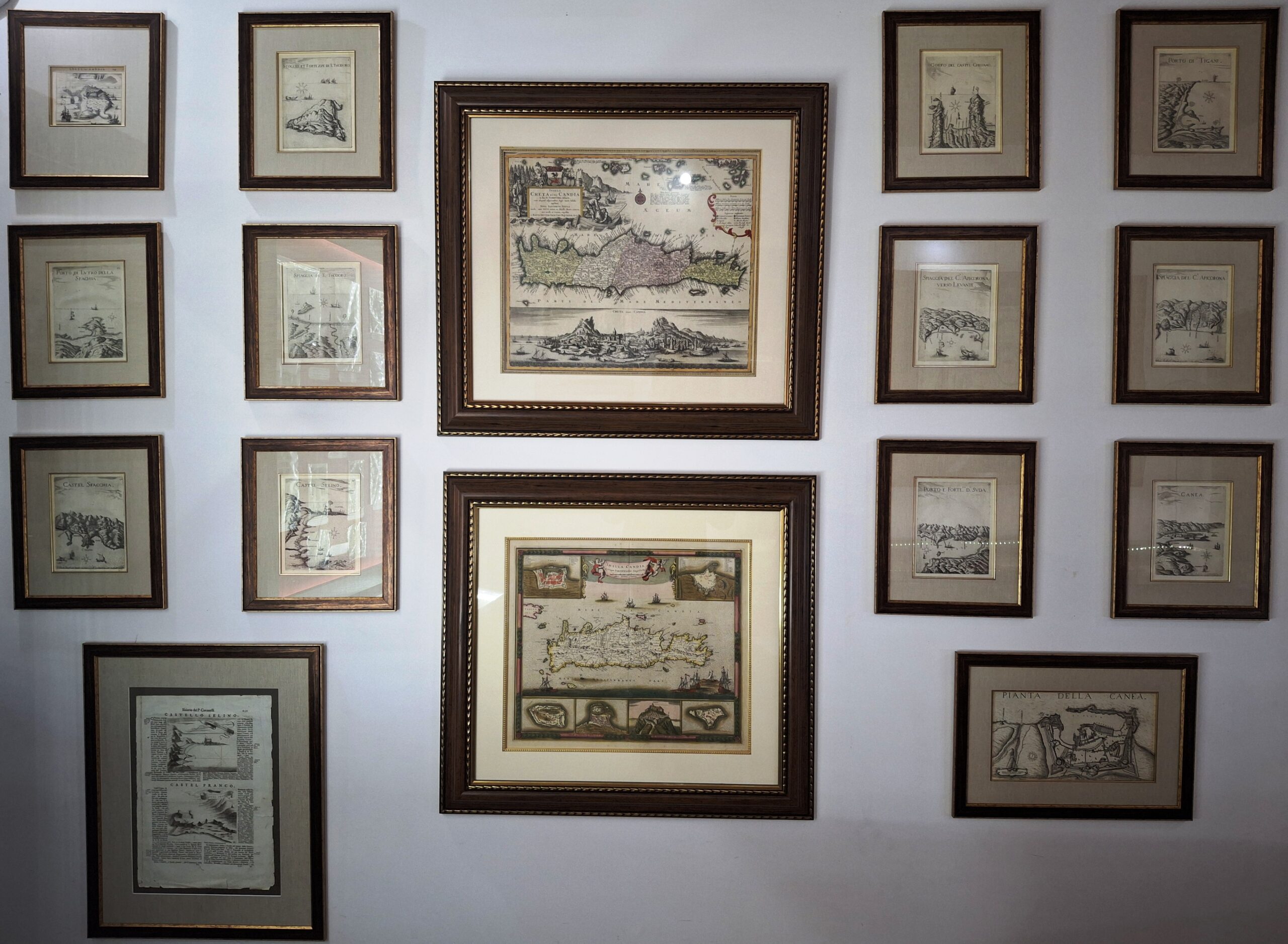 Στο κέντρο της συλλογής δεσπόζουν μια χρωματισμένη χαλκογραφία του Ολλανδού χαρτογράφου Frederik De Wit (1634-1706), Η Νήσος Κρήτη και οι οχυρώσεις της “Insula Candia ejusque fortification” από το βιβλίο De Wit, Frederik, Atlas sive descriptio terrarum orbis, Άμστερνταμ, π. 1680 και μια χαλκογραφία του Γερμανού χαρτογράφου Matthäus Seutter (1678-1757), Το νησί της Κρήτης χωρισμένo σε τέσσερα μέρη και άποψη του Ηρακλείου “Candia” από το βιβλίο Seutter, Matthäus, Atlas novus, sive Tabula Geographicae Totius Orbis, Άουγκσμπουργκ, μετά το 1744. Οι χάρτες μεγάλων διαστάσεων ολοκληρώνονται με τη χαλκογραφία του Φλαμανδού χαρτογράφου και γεωγράφου Abraham Ortelius (1527-1598), Η Κρήτη, το νησί του μεγάλου Δία, βρίσκεται στο μέσο της θάλασσας “Creta, Iovis magni medio jacet insula ponto” από το βιβλίο Ortelius, Abraham, Theatrum Orbis Terrarum, Αμβέρσα, 1584 και μια ανεξάρτητη χαλκογραφία του Henri Scheurleer, Turkey in Greece “Turquie en Europe”.