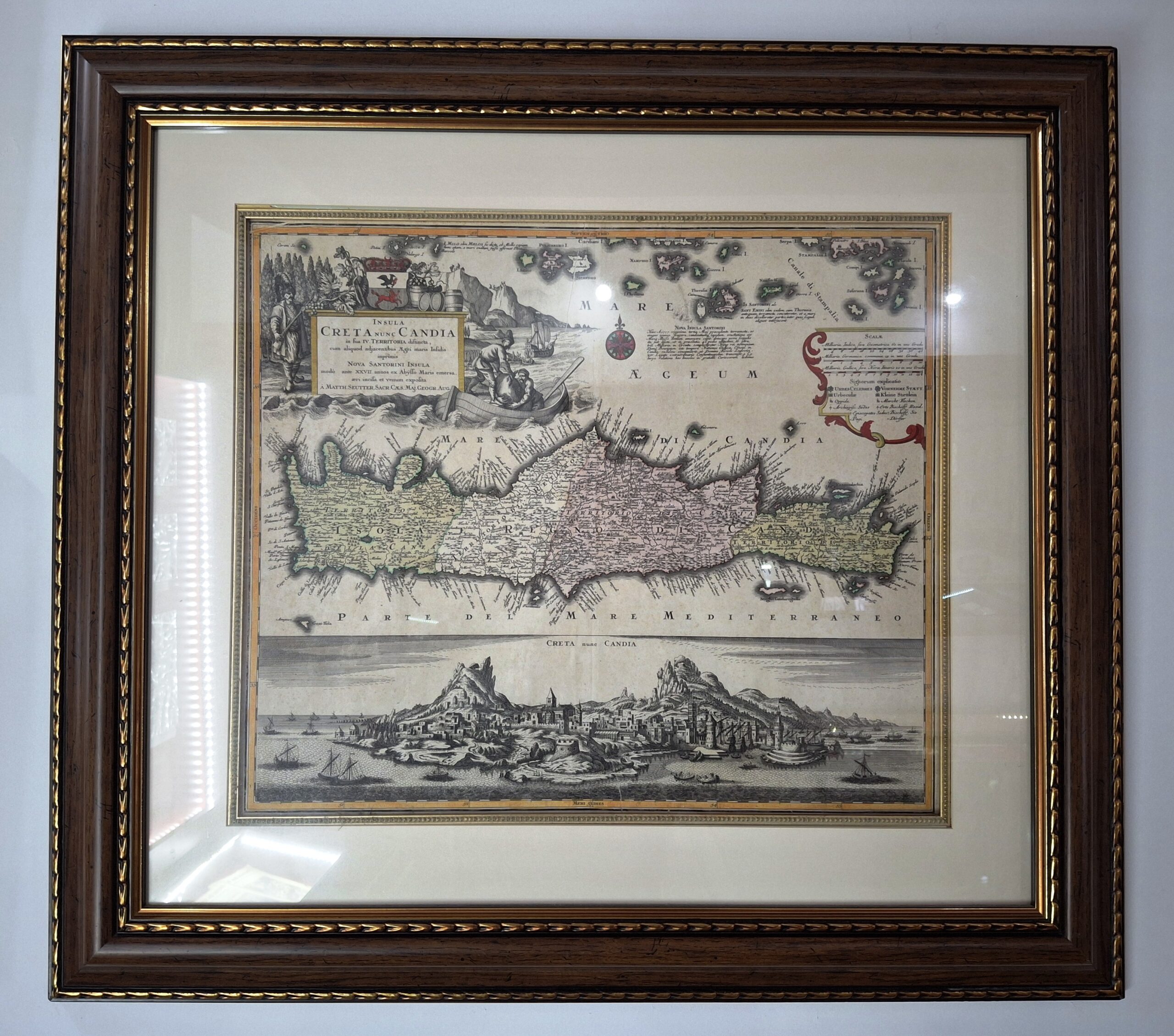 - Seutter Matthäus (1678-1757), Το νησί της Κρήτης χωρισμένo σε τέσσερα μέρη και άποψη του Ηρακλείου “Candia”, 1740, Χαλκογραφία, 50 × 56 εκ.