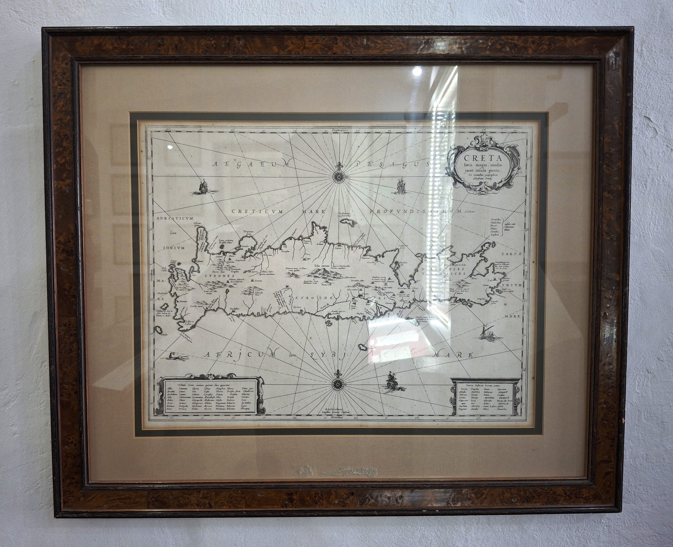 Ο Abraham Ortelius, με το Theatrum Orbis Terrarum (Αμβέρσα, 1570), θεωρείται ο πρώτος που προσέδωσε επιστημονικό χαρακτήρα στη χαρτογραφία, συγκεντρώνοντας τις καλύτερες πηγές της εποχής. Στην περίφημη χαρτογραφική του συλλογή περιλαμβάνεται και ο χάρτης Η Κρήτη, το νησί του μεγάλου Δία, βρίσκεται στο μέσο της θάλασσας “Creta, Iovis magni medio jacet insula ponto”, όπου η Κρήτη παρουσιάζεται με λεπτομέρεια, ενταγμένη στο πλαίσιο της κλασικής γεωγραφίας και μυθολογίας. Η μορφή του νησιού, επίμηκες από τη δύση προς την ανατολή, αποδίδεται με ακρίβεια, ενώ η αναφορά στον Δία υποδηλώνει τη σύνδεση του τόπου με τον αρχαίο κόσμο.