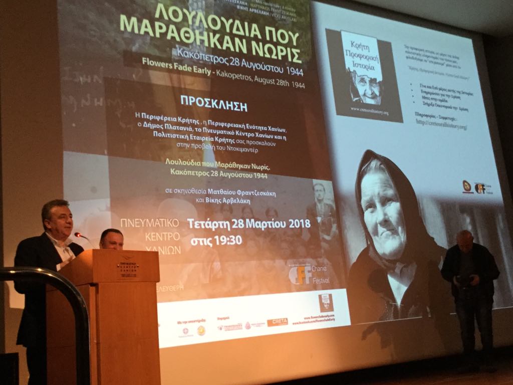 Με παρατεταμένα χειροκροτήματα και πολύ συγκίνηση έγινε δεκτή από τους εκπροσώπους της Εκκλησίας, των Αρχών, των φορέων και εκατοντάδων πολιτών των Χανίων η ταινία «Λουλούδια που μαράθηκαν νωρίς. Κακόπετρος 28 Αυγούστου 1944» που αναδεικνύει την ιστορική μνήμη και τους αγώνες των προγόνων μας για ελευθερία κατά την Γερμανική κατοχή. Η πρώτη προβολή του ντοκιμαντέρ με την παρουσία και των ανθρώπων που έζησαν τα γεγονότα (πρωταγωνιστές) έγινε στο κατάμεστο από κόσμο Πνευματικό Κέντρο Χανίων σε μια επιτυχημένη συνδιοργάνωση της Περιφέρειας Κρήτης, της Περιφερειακής Ενότητας Χανίων, του Δήμου Πλατανιά, του Πνευματικού Κέντρου Χανίων, και της Πολιτιστικής Εταιρείας Κρήτης.