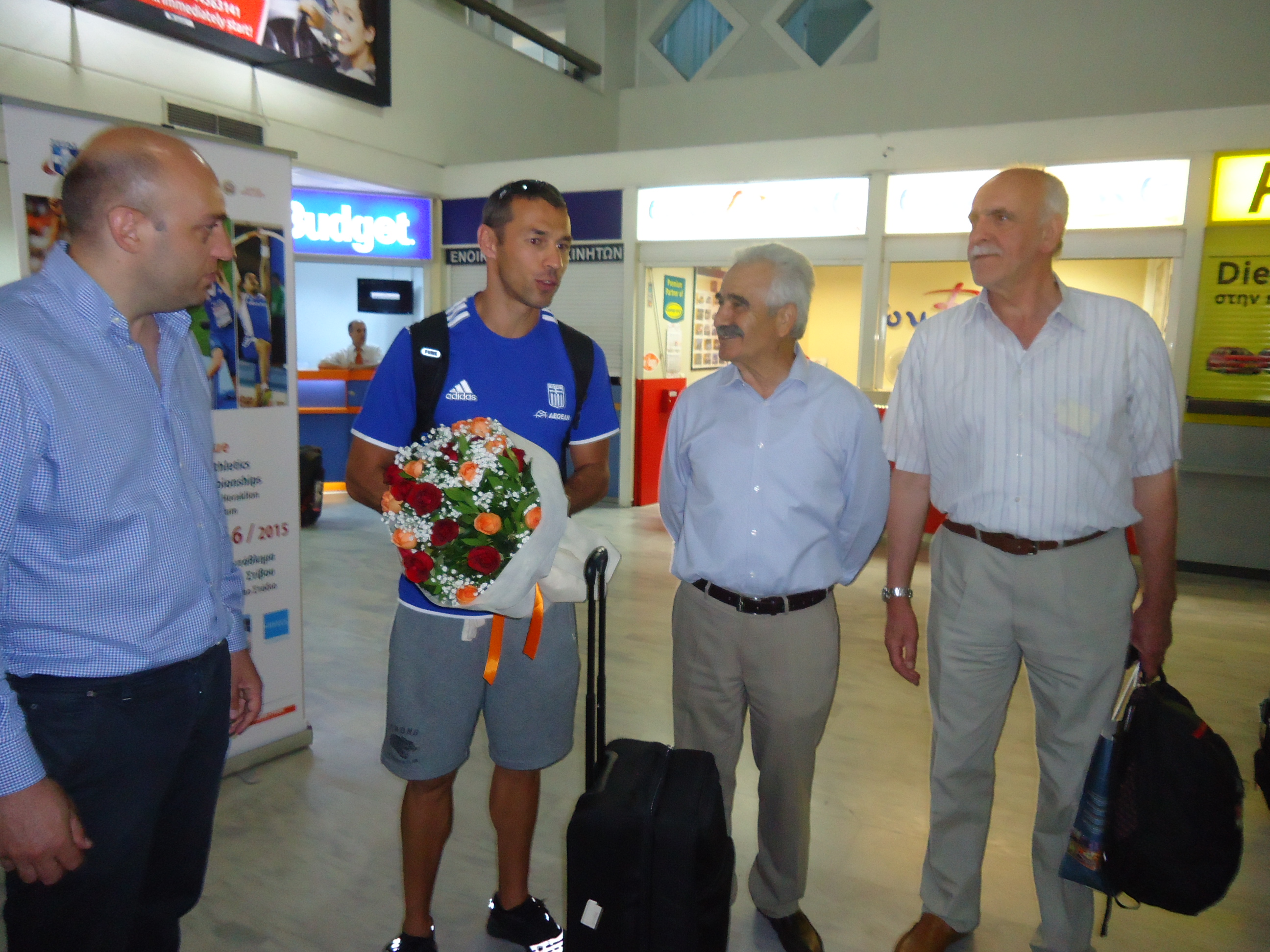 Την εθνική μας ομάδα στίβου με αρχηγό τον Παγκόσμιο Πρωταθλητή μας Περικλή Ιακωβάκη υποδέχτηκαν σήμερα στο αεροδρόμιο Ηρακλείου για την διοργάνωση του Ευρωπαϊκού Πρωταθλήματος Στίβου στις 20-21 Ιουνίου στο Παγκρήτιο, ο Αντιπεριφερειάρχης Ηρακλείου Ευριπίδης Κουκιαδάκης, ο Αντιδήμαρχος Ηρακλείου Κώστας Βαρδαβάς, τοπικά στελέχη του ΣΕΓΑΣ αλλά και ο αερολιμενάρχης Ηρακλείου Γιώργος Πλιάκας. Η εθνική μας ομάδα στίβου αφίχθηκε στο αεροδρόμιο Ηρακλείου συνοδευόμενη από τον γ.γ. του ΣΕΓΑΣ Βασίλη Σεβαστή και τον Αντιπρόεδρο Παναγιώτη Δημάκο.