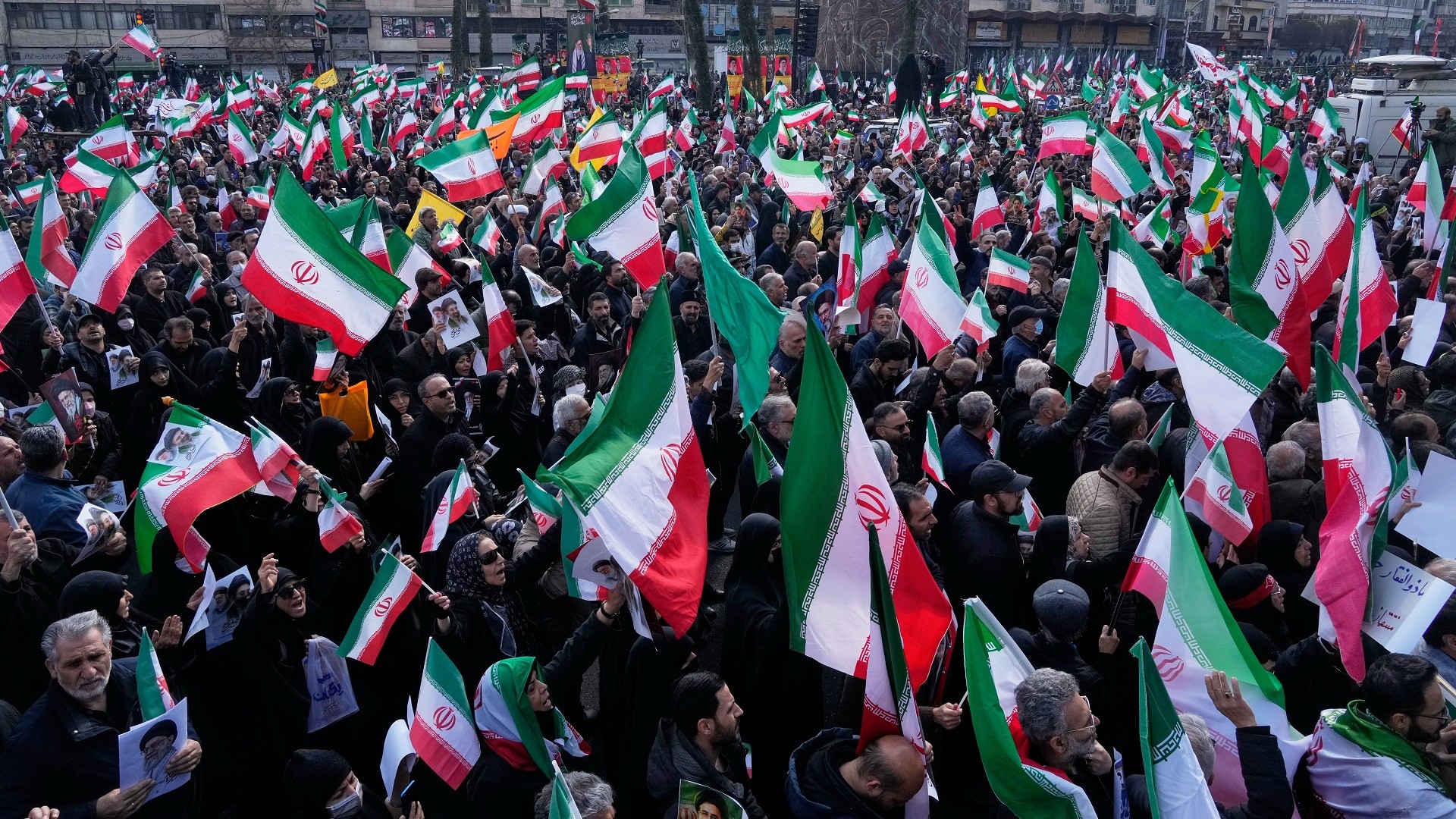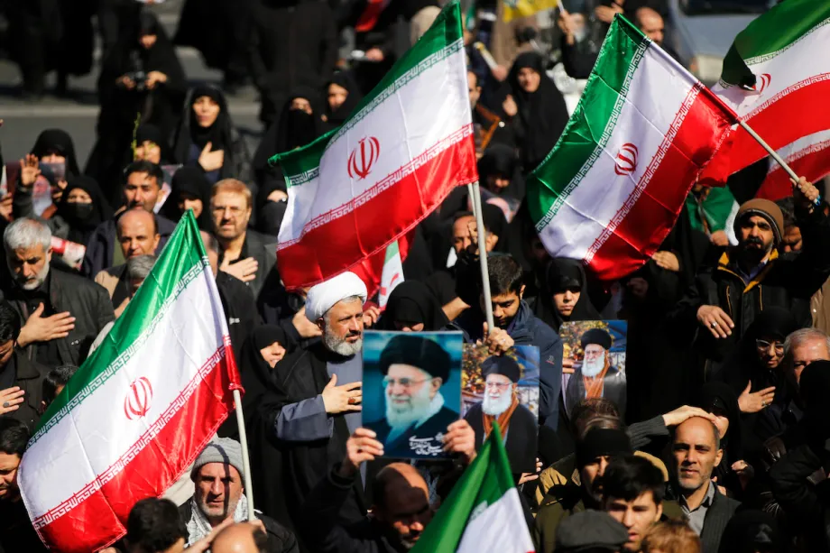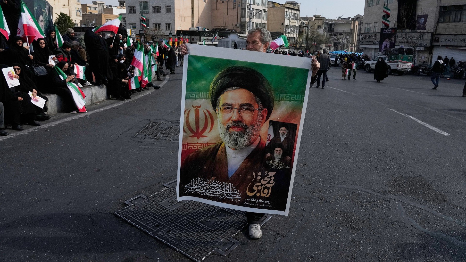 Το πλήθος συγκεντρώθηκε στην πλατεία Ενγκελάμπ στην Τεχεράνη κρατώντας ιρανικές σημαίες και πορτρέτα του Μοτζτάμπα Χαμενεΐ, γιου του Αλί Χαμενεΐ, ο οποίος κατείχε προηγουμένως τη θέση αυτή και σκοτώθηκε την πρώτη ημέρα των αμερικανοϊσραηλινών πληγμάτων εναντίον του Ιράν.