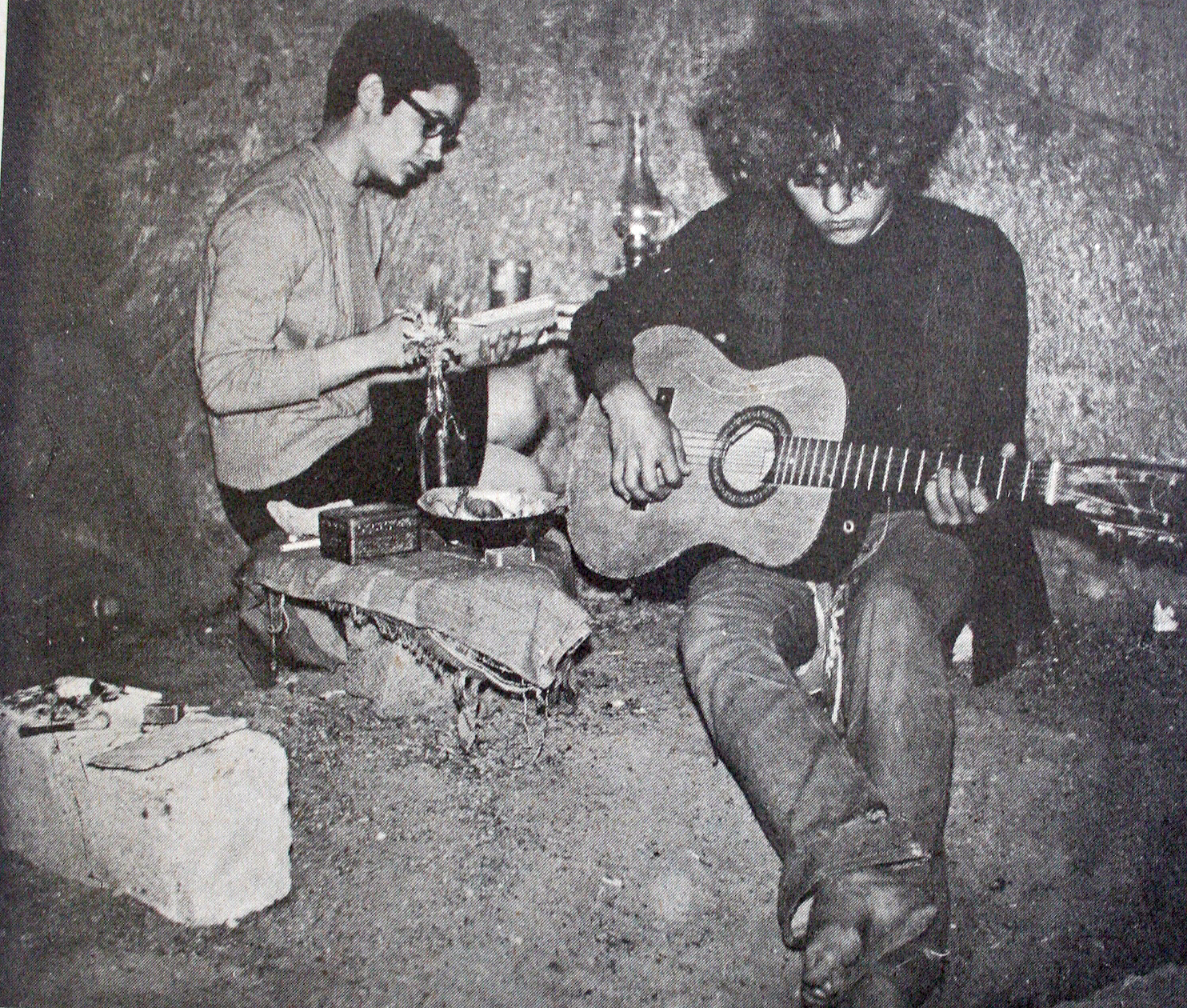 Φωτο: Χίπισα, έξω από τη σπηλιά της στα Μάταλα, παίζει κιθάρα. Ιούλιος 1968