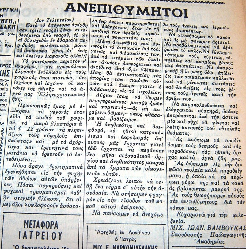«…όταν είδα τα μικρά παιδιά του χωριού ,να ερευνούν με τα αχόρταγα και ερευνητικά τους ματάκια τας νεαράς (με τα μπικίνι)…πόσα άραγε ερωτηματικά εγεννήθησαν εις την ψυχήν των αθώων αυτών υπάρξεων; Πόσοι ψυχικοί τραυματισμοί καθ ην στιγμήν βλέπουν ότι μεγάλοι κυκλοφορούν ασύστολα, ενώ εκείνα παρατηρούνται όταν εν τη παιδική των αφελεία σηκώσουν το φουστανάκι τους» (ΠΑΤΡΙΣ, 14 Αυγ 1965)