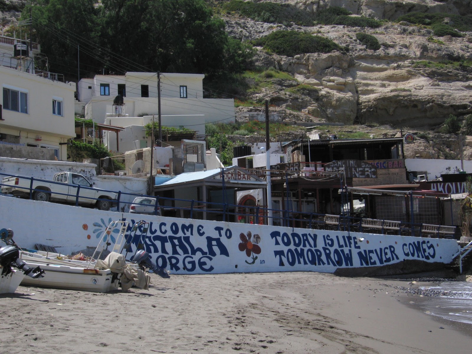 Το πιο διάσημο σε όλο τον κόσμο γκράφιτι, που συντηρείται ακόμη και σήμερα στα Μάταλα. Είναι γραμμένο από τον Γιώργο, τον ψαρά, πιστό φίλο των χίπις: TODAY IS LIFE TOMORROW NEVER COMES.